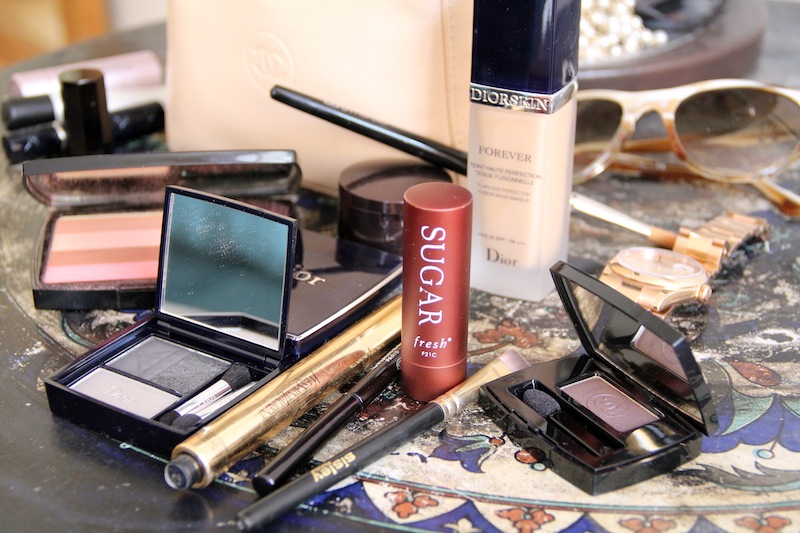 With makeup, sometimes I do it myself and sometimes other people do it for me. I do it not so badly, but it’s usually too light for television. I’m as experimental with makeup as I am with skincare. This little Chanel bag came with some makeup; I have tons of them. This is an ‘everything’ concealer, with powder underneath: Laura Mercier Undercover Pot in number two. It’s top secret. I use the YSL Touche Éclat for under the eyes and on the dark spots. I’ll do Dior Forever Foundation, or Chanel, or Shiseido—always a very light foundation that is fluid and transparent. And then I like the Taupe Grisé Chanel eye shadow. Or, this is new, and I find it very very clever—this is Smoky Eyes by Dior. The packaging slides like a cell phone; they are very proud of it, they told me. [Laughs] I don’t use the sparkly color—I like a very matte eye color—so I use the dark grey and the pale grey. You can do it with your finger, and it lasts for a very long time. I also like very much color for the cheek; for me it is very important. If I had to keep one thing it would be blush. In very ‘old lady’ pink. I can just put it on the cheek and under the eyebrow, and I just feel more awake and fresh. And I’m always looking for the perfect lip conditioner, so I try everything. At the moment I like Fresh Sugar.