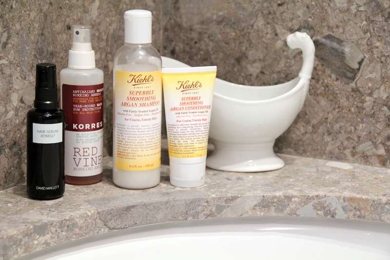This is really nice, Superbly Smoothing Argan Conditioner by Kiehl’s. I like Kiehl’s a lot for hair, and Aveda. And I have things for the sun, and every moment of the year! [Laughs] To put texture in my hair, I used to bring some water from the Mediterranean Sea and put it in a spray bottle. But I haven’t been for a while so I don’t have it anymore! This is for the sun— Korres Red Vine Year-Round Sun Protection which I put on if I’m going to be outside a lot.