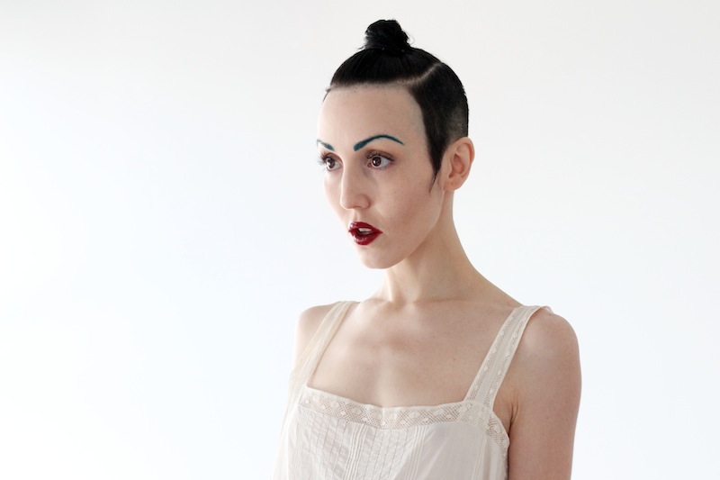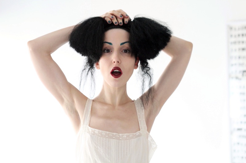 I use a lot of bobby pins, zillions and zillions and zillions. When I do the wigs and hairpieces—sometimes it’ll take me thirty minutes to get all the pins out—and it’ll just be a mountain of them next to my bed. There’s one hairpiece Danilo did for me, from my performance in the window at Bergdorf For Fashion’s Night Out that doesn’t take any time. You just literally pop it on. With my own hair shaved on the sides, it’s like hair-cessories. That’s also why I keep it so short, because I know people who have long hair and then they have shoots and they put on wigs, but like, wrapping that all into into wig caps, all that nonsense, is a nightmare. When you have no hair, you can have any hair. People are like, ‘Oh, why don’t you grow out your hair?’ and I’m like, ‘You know what? I can have any hair that I want,’ any day, any moment—and that’s what’s really fun. I think people don’t get how easy it is to play. Like, I think of makeup as just fun paint. I’m just painting my face. The way I would do a drawing, the way I would do anything.”