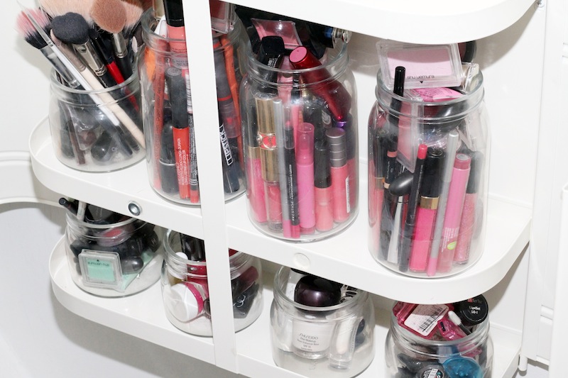 I don’t have a hard time doing makeup. I mean, I can really go all out—from Geisha to whatever, in five minutes. I’m not a tinted moisturizer and gloss kind of girl. Let’s put it that way. I like things that I can really use for transformation. I have lots and lots and lots of makeup. I love color. I have these cabinets and jars because I like organizing everything by color. I have all my tools, separators, setting agents, glitter glues, sharpeners, waxes to line the outside of your lips so that your lipstick doesn’t bleed, then I have white and luminizers; I love mint with this plum kind of color—I have that combination there. These are my pinks, my oranges, my greens, my yellows, my golds, my lavenders, my blues, my blacks, my whites, my mascaras. This is all false lashes and then theatrical makeup palettes, purples, nudes, more lashes, more brushes. And that’s not really all of it, because then what comes next is what really people know me for—which is bold lips. I have my big jar of reds. I would say that red lipstick is kind of my signature thing—pale clean skin, big lashes, red lips—when I’m in a huge rush, that’s what I do quickly, but I play with makeup a lot. Today I’m blending Ruby Woo with Julie Hewett’s Coco Noir with MAC’s Nightmoth pencil—so what you have is this kind of like, brownish red, a really pure red, and a purple. Then I’ll top it off with Dior's Black-Tie Plum gloss. So it’s going to be this really shiny red lip. That’s why I felt like teal eyebrows need like a deep, deep blood lip. I use my makeup as artistry. Fashion designers design clothes, and I design looks. When I thought about the teal eyebrows, I wanted the lip to look like fresh blood.