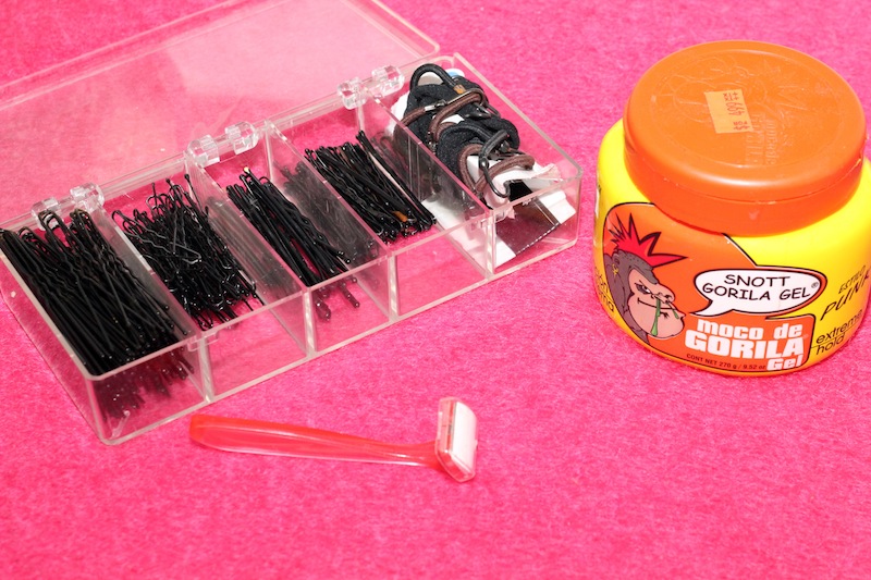 My hair is the easiest thing, because really—with a really good shampoo and conditioner and a box of bobby pins and some hair spray, I can do whatever I want. It’s more about the hairpieces, you know? So you saw me doing my hair—it was in a little ponytail, and then I knotted it and then I put some bobby pins in, do a little touch-up, with a razor, then I’m going to show you the last trick of my hair…this is my secret weapon: ‘Moco de Gorila,’ Snott Gorilla Gel. It’s made for kids, because you know how kids love mohawks? It’s made in Mexico. I was with Danilo when he discovered it, and we started playing with it. It’s the most intense gel that I’ve ever used in my life…like, I even have to add a little bit of water. But it shampoos right out, surprisingly. The way it smells is toxic, but it wears off really quickly. Even Danilo’s turned Rooney Mara onto this. Have you seen her with this slicked-down hair lately? This is the secret. And he gave me these little baby Japanese razors—which are amazing—and taught me how to shave my hairline. This is very dangerous, by the way. Danilo has been like, ‘Okay, calm down—taking it back a little too much,’ and then, ‘Okay, girl. Drop the razor.’ He had given me a pair of baby clippers too, and then he took them away. He was like, ‘You’re not allowed to have those anymore.’ [Laughs]