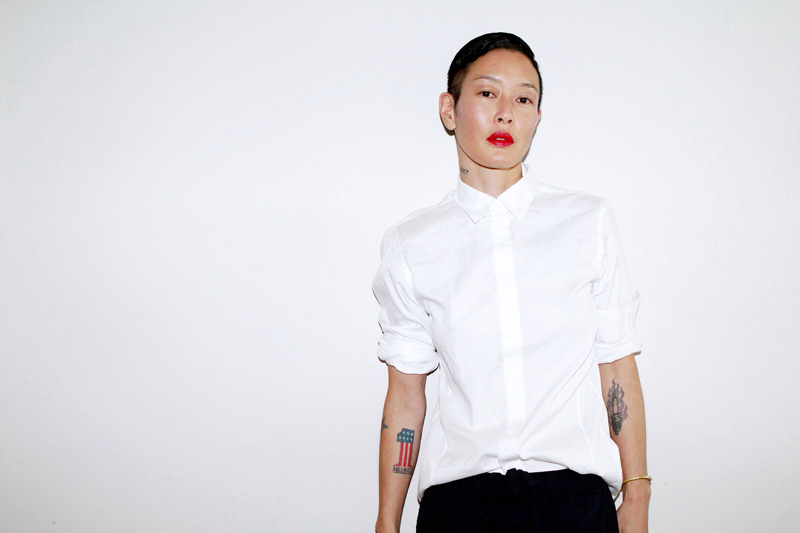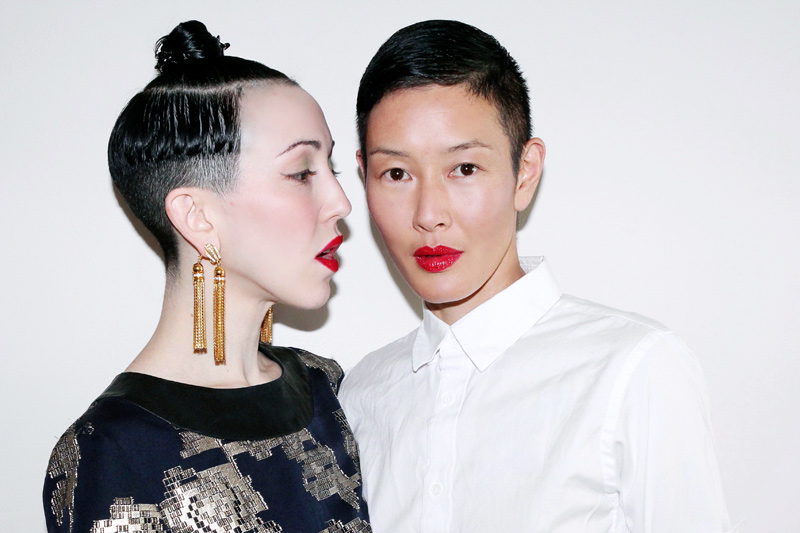 When I heard that Jenny Shimizu had teamed up with “online concept boutique' House of Exposure and lipstick guru Poppy King to create the perfect red—Helmut Red, an homage to Helmut Newton heroines—I wondered if the poster child of Nineties androgyny (Ck One, remember?) had gone femme. The answer, it turned out, was no. Dressed in a crisp men’s button-down from +J and cuffed linen shorts (also swiped from the men’s section at Uniqlo), Shimizu confirmed my sneaking suspicion about her beauty routine—or lack thereof. “Honestly?” she said, “I don’t wear much makeup…or really any makeup.” On the opposite end of the spectrum is Michelle Violy Harper, fresh off a plane from Paris couture and at Shimizu’s side, who has never met a compact she didn’t like. On this particular afternoon, she’d dipped into a mint-green eye shadow by Shiseido (from the Silky Eye Shadow Quad in Ocean Shimmer) complemented—of course—by a hearty helping of the lipstick du jour. “That’s the thing that I love about this red,” she said. “You can do a weird green eye shadow with a strange teal-black eyeliner… You can pretty much do anything with it because of the blue base underneath. Creating a universal red is really a challenge, but this one looks good on so many different people.” Harper used Shimizu to prove her point, applying several coats of the “glossy, incredibly emollient” formula to her makeup-free companion.