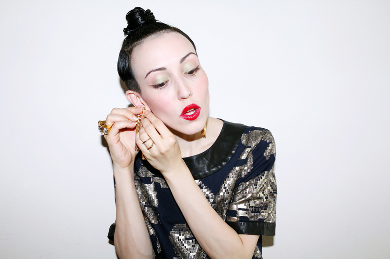 Michelle Violy Harper, wearing a Jen Kao top and skirt, Karen Walker belt, and House of Lavande Made In Italy jewelry, and Jenny Shimizu photographed by Emily Weiss in New York on July 6th 2012. The limited-edition lipstick is available at House of Exposure.