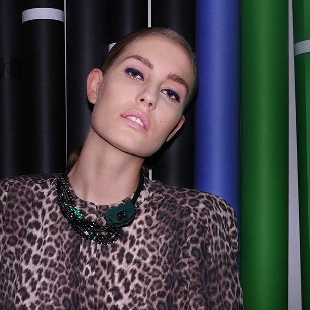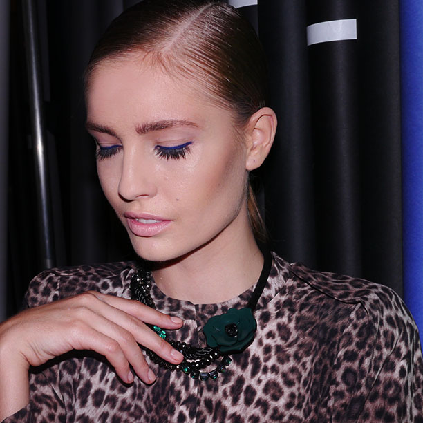 Speaking of Monsieur Saint Laurent, Nadja Bender [pictured] was rocking a vintage leopard-print dress that looked straight out of YSL’s late-'70s collections. The Danish model seemed every inch the Helmut Newton powerhouse Hanlon had been channeling. When we saw her eyes, accented with a swath of thick royal blue liner at the lash line (similar to the azure mascara Jeanine Lobell used at Stella McCartney for fall, and again for resort), we grabbed her for a few snaps. Then, we chased down Altuzarra's makeup man Tom Pecheux for the details. “By playing with color, you add dimension to the eye, to what you can’t see. If you have a black diamond, you see the cut of it, but that’s all. If you have a white diamond, you see the cut and you can jump in it—there’s dimension to it. Adding the color brightens up the eye, makes it lighter. I chose the royal blue, the Technakohl liner in Auto-de-blu, and then used the Ron Ron Ron shadow from the Archie Comics quad [slated for release in Spring 2013!], this gorgeous blue. It makes the eyes pop, I find it super chic. This season, the designers all want very minimal makeup: a color, but a washed-out color, and to me this blue looks almost like a wiped-out black. I like the little touch of it, it’s not aggressive or tense, but it adds a lot.” No kidding.