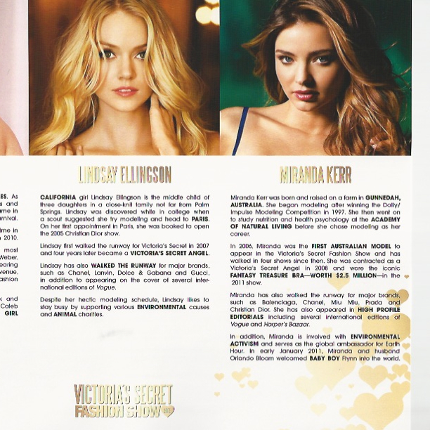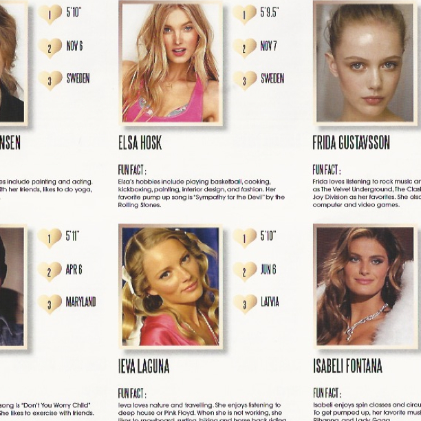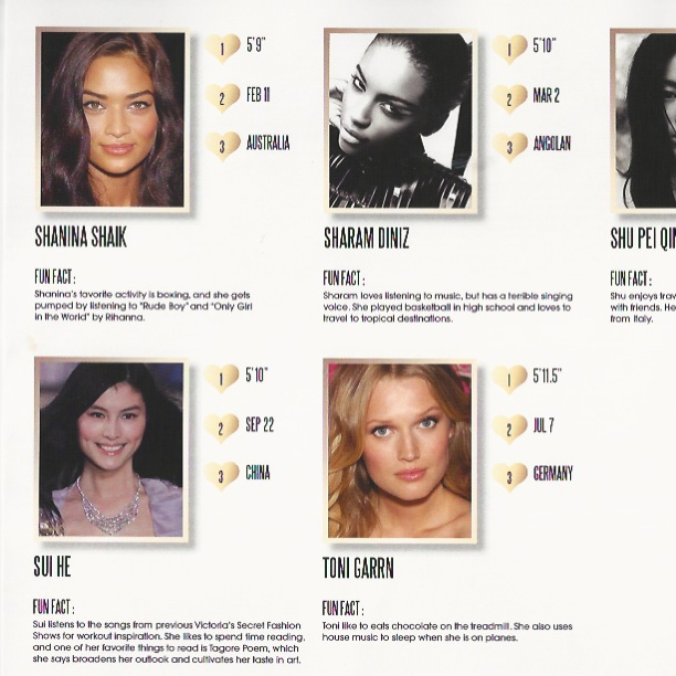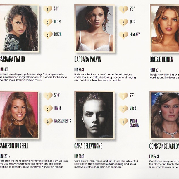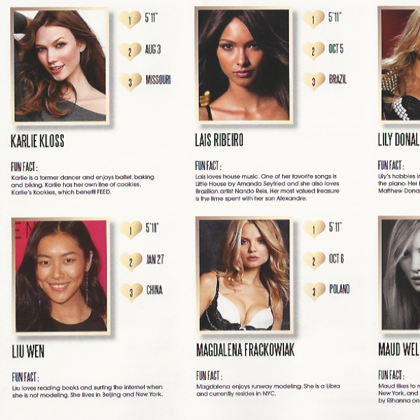 So Emily just got back from backstage at the Victoria's Secret Annual Fashion Show (more on that tomorrow), and she came bearing gifts! Namely, the press pack, which Tommy Ton pointed out to her as being worth a read. And? It is. The tip sheets have 6 models a page and include their heights, birth day/month and state (or country) of origin. Also, a Fun Fact (that kind of reads like a personal ad!)! Nearly all involve working out, quite a few mention Rihanna, and some favorite snacks! We pulled out a few of our faves. Read 'em and weep: