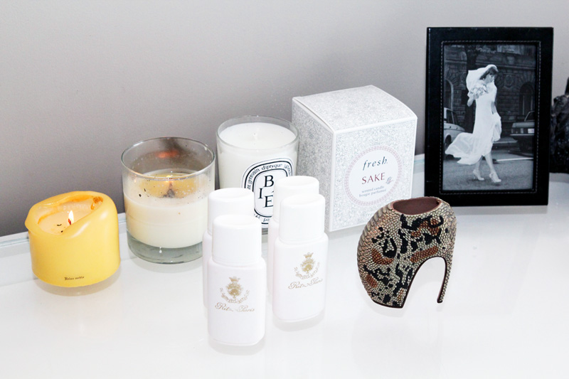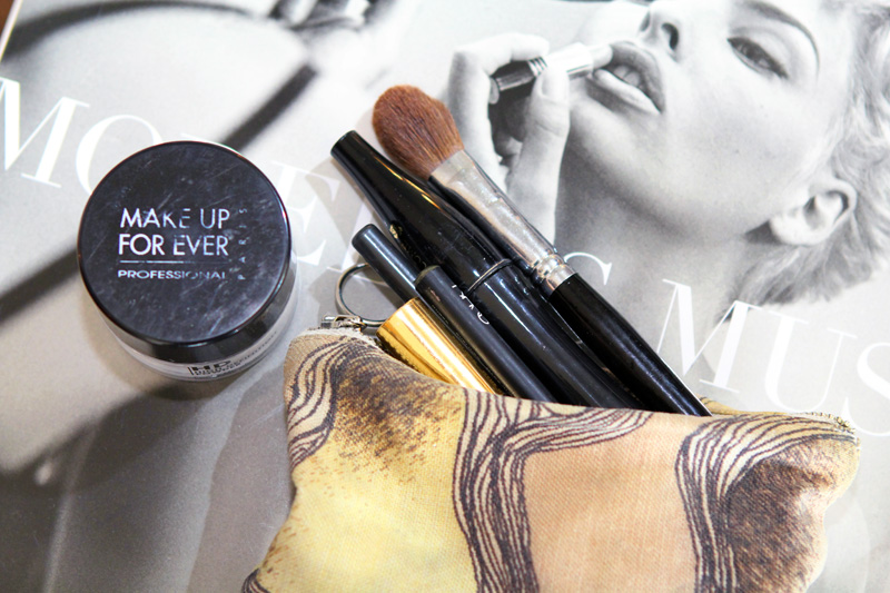 For makeup, I only have a few things, which I keep in a little Roland Mouret bag. First, Make Up For Ever HD powder, just to dust over my face so it doesn’t get shiny when it’s hot; I have a little Shu Uemura brush I use to put it on. Then, some eyeliner for when I go out and want to do a smoky eye—either the Nars Kyoto Pencil or the Graphblack Technakohl Liner by MAC—and Lancôme Hypnose Mascara. Also, YSL Touche Éclat, which I just dab under my eyes and around my nose, and if I want to do a big smoky eye, I add on to the eyeliner with black Nars Zardoz Cream Eye Shadow. But I’m really not good at doing makeup on myself, so I don’t do it that often.