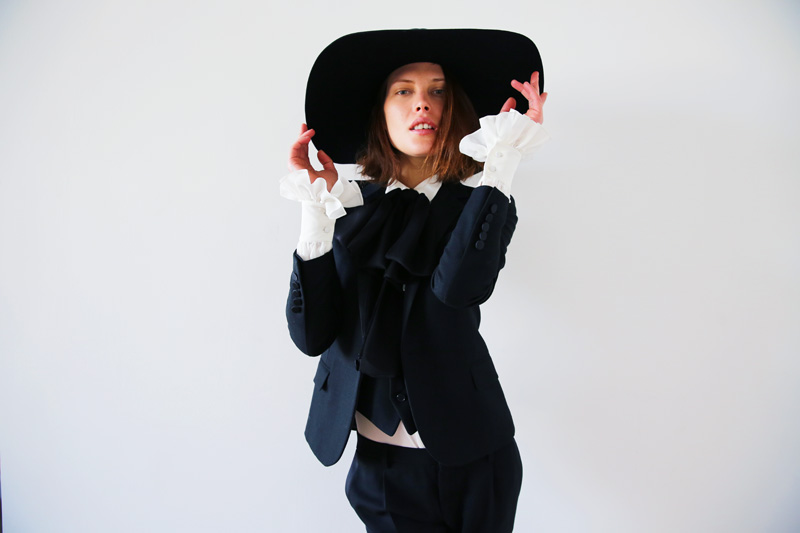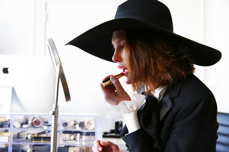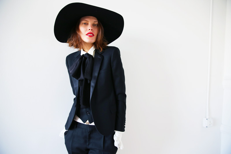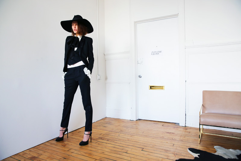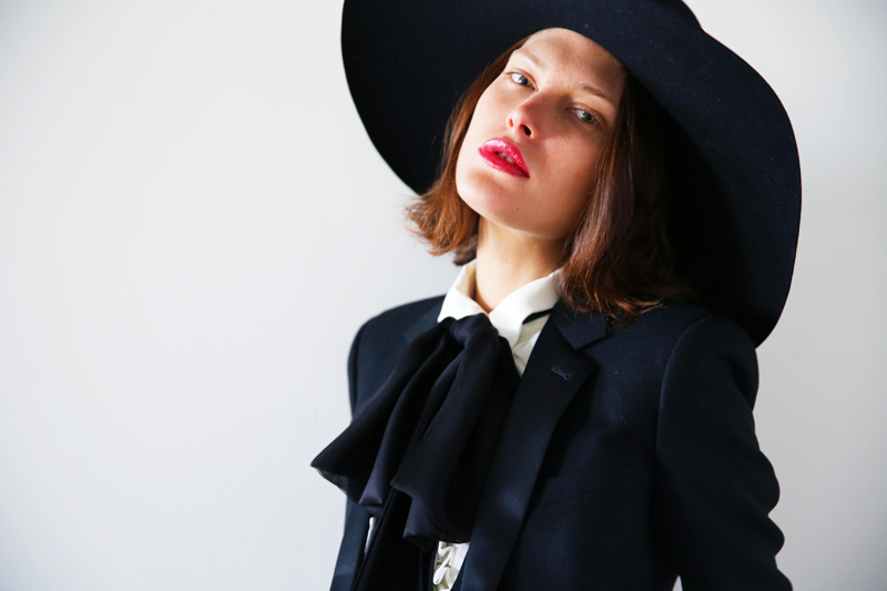 There we were, gearing up for Fashion Week and all that that entails (stocking up on band-aids, sharpening our heels, stretching our taxi-hailing arms, practicing our backstage-blitz maneuvers, etc), when we got a little hankering to just get to it. FASHION! So, we called up Catherine McNeil, one of our favorite girls—who is looking, well, major— and put her in the clothes that we're all dying to wear right now: those nipped-in jackets, silk shirts, and cigarette pants from Saint Laurent, specifically Look 1 from Hedi Slimane's first show, replete with wide-brimmed black hat and vibrant lip, courtesy of YSL Rouge Volupté Lipstick in Red Muse.