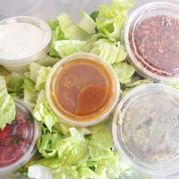 Lunch: Emily and Nick alternately shoot me nasty looks as I dig into FOOD, specifically a taco salad [18] with lettuce, “spicy taco crumble”—still not sure what that really means, exactly—pico de gallo, guacamole, cashew sour cream, and cilantro-lime dressing. I wash it down with a side of Swan Greens Juice. As I generally have my lunch salads with a soda on the side, I feel super healthy. Am I growing up?