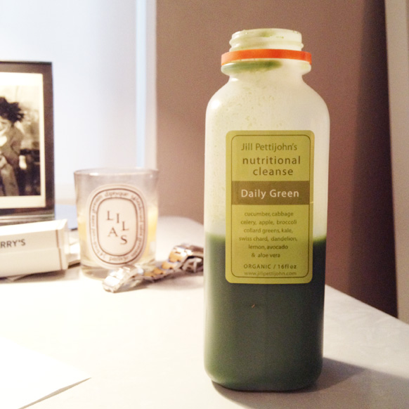 Morning: The Daily Green, a blend of cabbage, broccoli, celery, collard greens, lemon, avocado, and other stuff, isn't so bad! I'd heard from my friend Anne Slowey that Jill, a former private chef to Donna Karan, made the most “nutritionally sound' cleanses in town, and also that the drinks were “a little rough' since they were devoid of any kind of sweetener, even agave, and are very finely blended rather than cold-pressed (meaning: light pulp). And Anne was right—this has got more 'texture' than the green juices I'm used to drinking, because it's not a juice; it's got stuff in it. Totally fine.