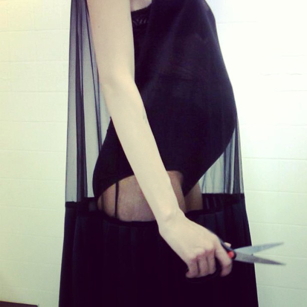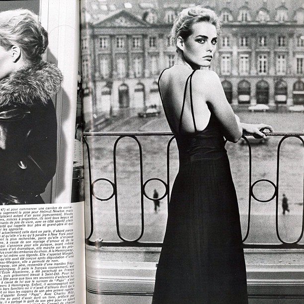 So, one afternoon while hunting for muses online I happened upon a photo of Mariacarla Boscono [1] that made me go cross-eyed with delight: her alabaster cheekbones, her lady-boy body standing proud and shamelessly against a pillar. She’s clutching a black evening dress that has fallen to her thighs. I don't have to wear a gown to be elegant—I am elegant, she seems to say. The picture swept me off my feet. So, of course, I posted it.