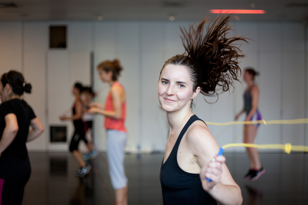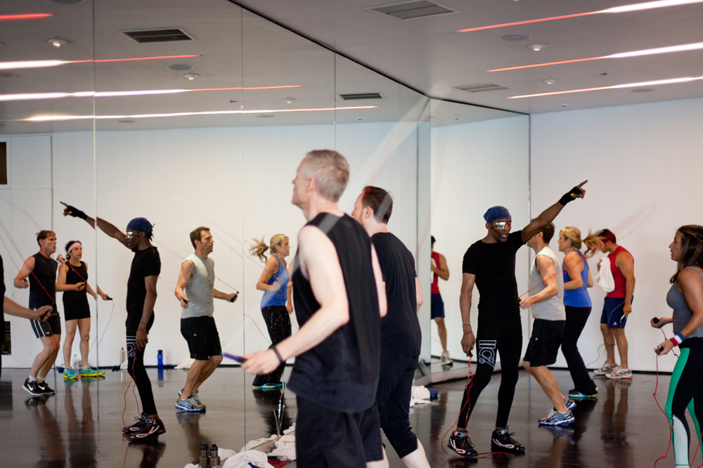 The class gets off to a fantastic start. Some light jumping around to warm up, then we pick up the jump ropes, which Michael calls the “rain makers” for their sweat-inducing power, and… I kind of can’t believe that I still know how to jump rope. I’m keeping up with everyone, and it’s kind of fun! Just as I start to wonder if it’s too late to pursue what's clearly my true career calling—professional jump roper—Michael yells, “ Double time!” I almost laugh, because, obviously, there is no way anyone could go faster than the class' current speed. BUT THEY CAN. And they do. Everyone is crisscrossing their ropes like they’re auditioning for The Fighter. And Michael asks us to change speed or do something new every ninety seconds because, he later tells me, mental exhaustion comes before physical exhaustion.