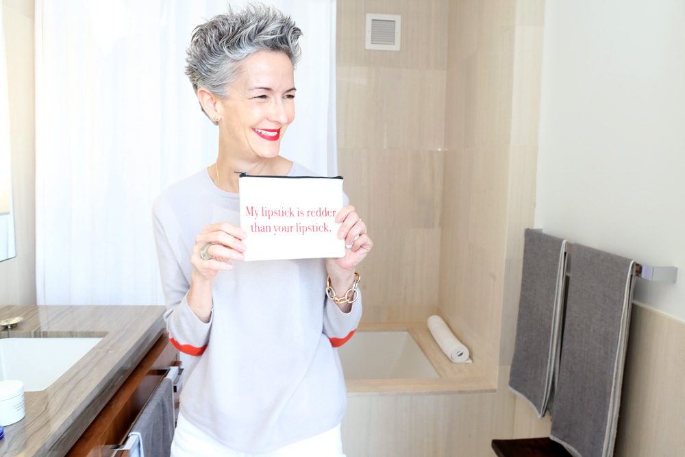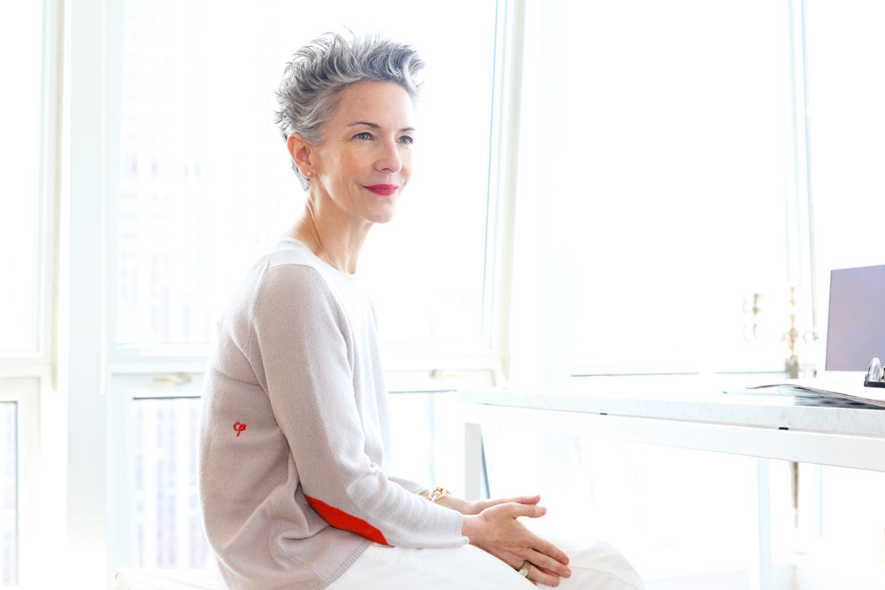 I’m extremely low-maintenance with my hair. It’s either long or short. I started going grey at 26, but I wasn’t confident enough to let that happen yet. When I was 37, I moved to France and I thought, ‘I’m anonymous here. I can do this.’ And I let it go gray, cold-turkey. My hair was long at the time, like down to the middle of my back. The top was gray, but the bottom was still really dark, so I wore it pulled off of my face, either back in a chignon or a braid. It wasn’t cool. And the French can be pretty direct. I remember one guy in my office said, ‘Are you sick? Are you ok?’ He thought for sure that was the only way I would let my hair go gray. But, you know, it was OK. It scared me, because it’s like losing your youth, but it’s totally psychological. Once it grayed all the way down, I had it cut. I called my stylist and she said, ‘Come at night, I’ll get a bottle of wine—you’ll need alcohol.’ I can’t remember who said this—I think it was Jennifer Lopez or someone on her team—but after I went gray, I walked into a meeting and somebody there said, ‘Oh my God, I feel like I should sit up in my chair a little bit taller. You look really serious, and I should pay attention to you!’ I thought that was great. I’ve kept it short since that cut, not for lack of trying to grow it out. I was inspired by Kristen McMenamy’s long silver hair, but, oof, it was brutal. I couldn’t do it. One day, I’ll just pull it back into a long braid like Georgia O’Keeffe. I think that’s so chic. But, until then, at least my hair doesn’t involve much care.