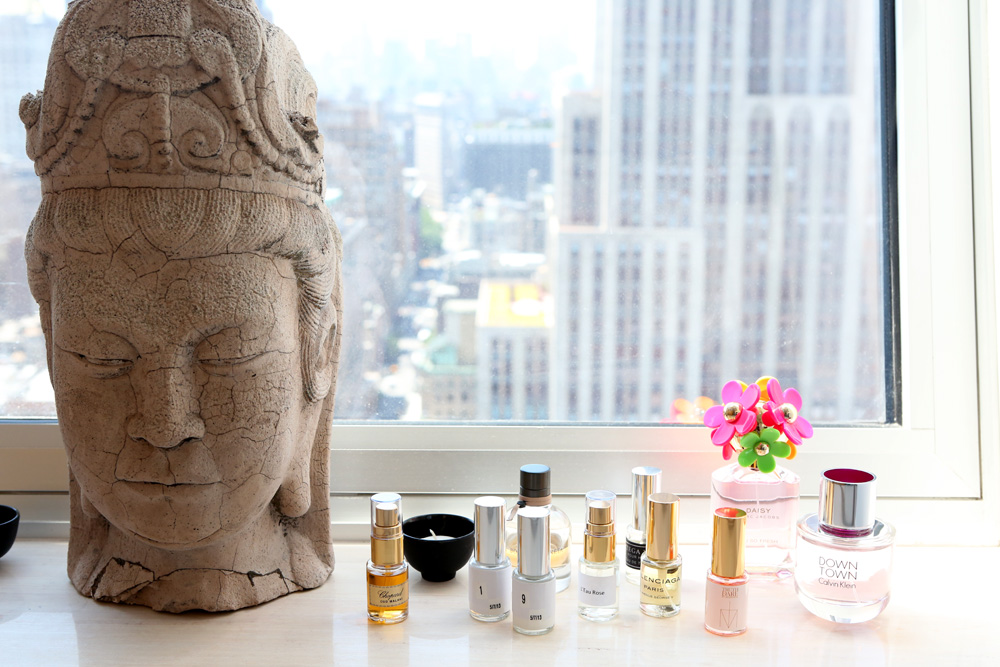 Something you should know about wearing scents is that they hold better when applied to moist skin, and you’re not supposed to rub them into your skin. What you’re doing is crushing the architecture of the scent—there’s a top, middle, and base, and those parts reveal themselves at different times. You can also mix scents, and that’s all personal preference. Sarah Jessica Parker is a prime example of that. She came up with Lovely because she was wearing a mixture of an oil and a spray scent. She created her own thing from it.