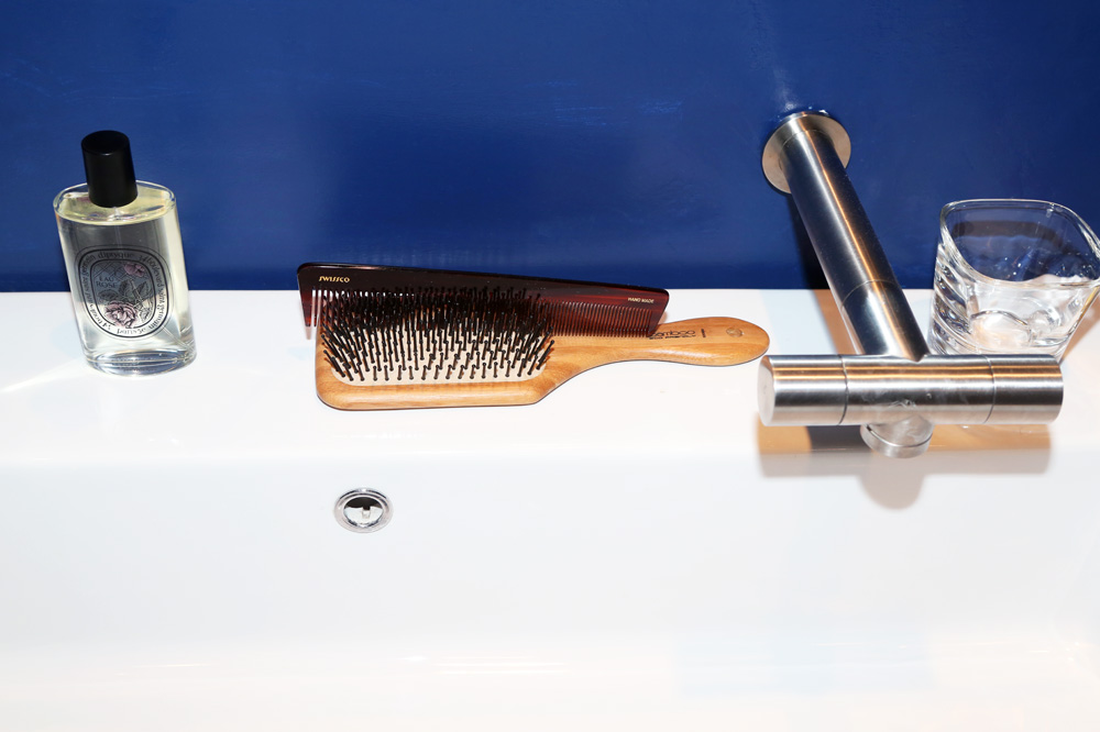 We also share shampoo, the Wen Cleansing Conditioner, which I tried by accident and thought, ‘This is so great.’ It’s all-natural, and makes your hair really shiny and so soft that you don’t need conditioner—it’s all-in-one. You just put it on for five minutes and wait—I use that time to brush my teeth. I have thin hair that gets tangled very easily, but the Wen makes it so much easier to comb through.