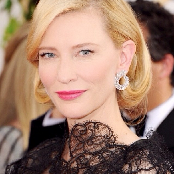 Our dear pal Jeanine Lobell took a refreshingly soft-handed approach to Cate Blanchett's Golden Globes makeup. Think of it as diet formal makeup—formal makeup light for our European readers. Just powder foundation blended with powder blush (Lancôme Translucence Mattifying Silky Press Powder and Nars Highlighting Blush in Satellite of Love) to define her cheeks, Nars brow shader and gel, and a sheer rosy lip created by layering two of Giorgio Armani Rouge Ecstasy Lipsticks—the pinky nude Boudoir over the raspberry Scarlatto. She forwent eyeliner (which we didn't even realize was an option for these kind of things) for lots of mascara and a few individual lashes, creating depth on the lids by dusting the golden pink shadows from Chanel Les 4 Ombres Quadra Eye Shadow palette in Intuition beneath a dab of the shell pink, shimmery Illusion D'Ombre Long Wear Luminous Eyeshadow in Emerveillé.