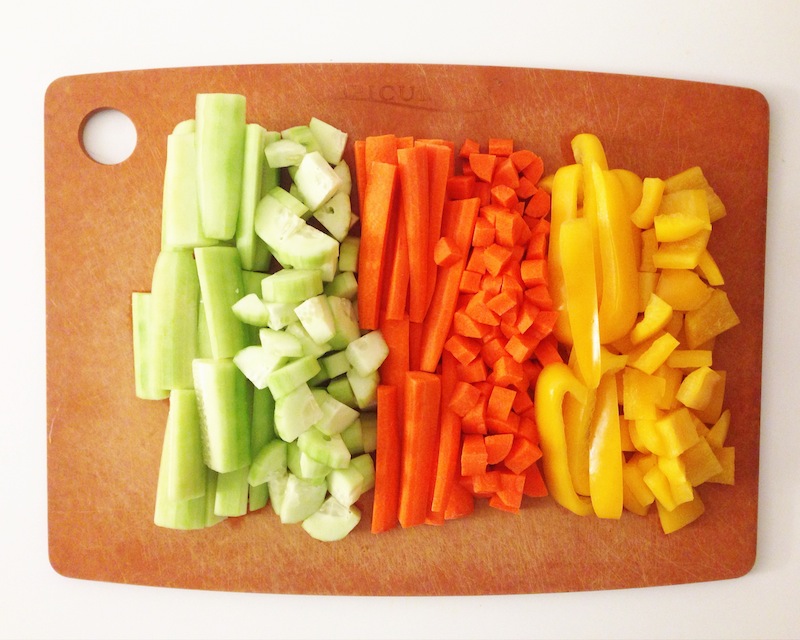 I bring carrots, peppers, and cucumber spears with hummus to work daily. Cut up enough for a couple of days so you don’t need to do it every night.