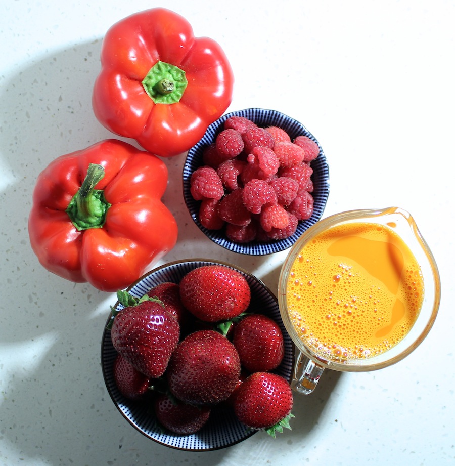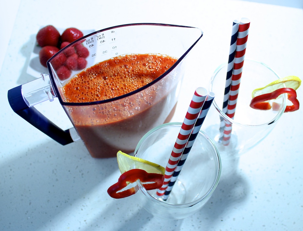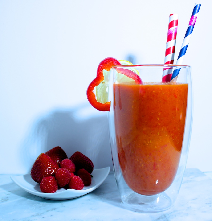 Between the rain, shine, allergies, and air conditioning, spring is a tough season to avoid falling under the weather, which is why I like to give my body a little help with this immunity-boosting smoothie. Red fruits and veggies are loaded with powerful vitamins and antioxidants that, in addition to keeping you virus-free, help fight heart disease and cancer. This smoothie has plenty of vitamin C to keep your immune system up, vitamin A to give your skin a healthy glow, and a little spice to kick your metabolism into full gear (hello, bikini season!). Enjoy this icy, sweet, and savory treat with your morning breakfast, as a midday snack, or anytime you want to give yourself a little boost.