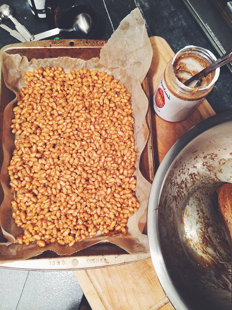 Desserts (the making and eating of) are one of my favorite things to do to unwind on the weekend and my go-to place to find recipes is...Instagram. I seriously spend so much time scrolling through my phone searching through endless little Amaro-filtered desert posts. But I always try to make each one unique to me (mostly raw, vegan, won't cause seismic disruptions to my glycemic levels...), so that means substitutions. Here I combined a few recipes to make caramel-covered chocolate almond butter rice crispy treats:
