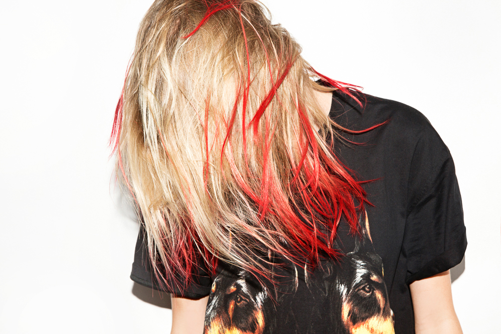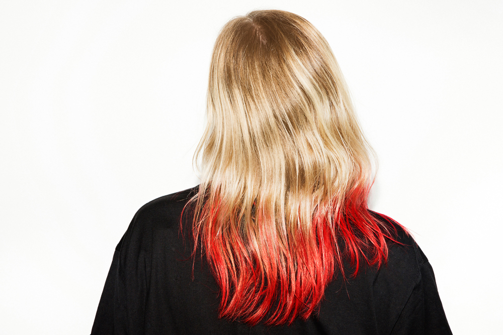 Call it fate or call it coincidence but we just happened to have some bottles of Redken Color Rebel lying around, silently begging for some use. And Marique had tickets to a concert later that night, for which some dip-dyed red ombre would be perfect. The color was carefully sponged on (the applicator looks a bit like those bingo markers you always wanted to paint with as a kid), first coral, then faded into red. And her agent doesn't have to worry—the color will be gone in two washes.