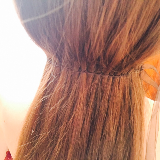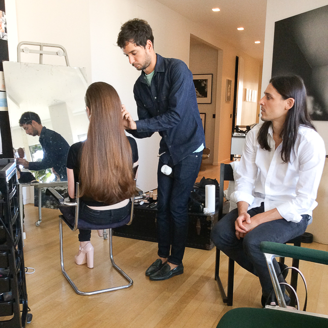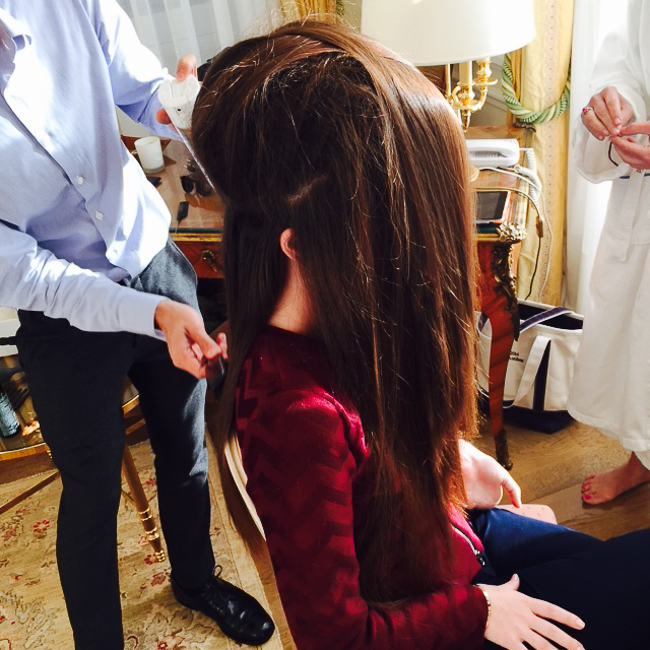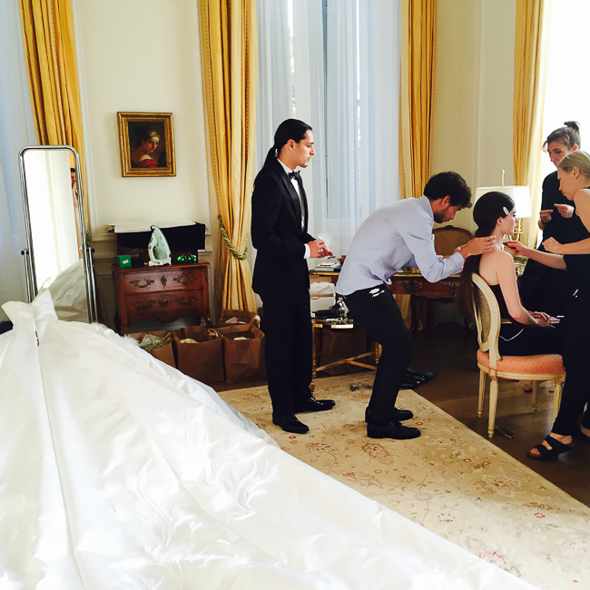 My hair was a story in itself. I love wearing it down but also wanted it out of my face for the ceremony. And, of course, it had to balance out that crazy full skirt. I test-drove a few styles—Olivier ended up commissioning a hairpiece that matched the embroidery on the dress and Luciano wove a ribbon through my hair to create a flat ponytail. The day-of, it took four hours for them to get my hair to stay in place. In the end, they had to sew it into the veil with a needle and thread! My hair is long and heavy, so Luciano gave me a lot of lift on top (just look at that teasing!). After the ceremony, he brushed my hair out so I could wear it down for the reception with my second dress by my friend Prabal Gurung.