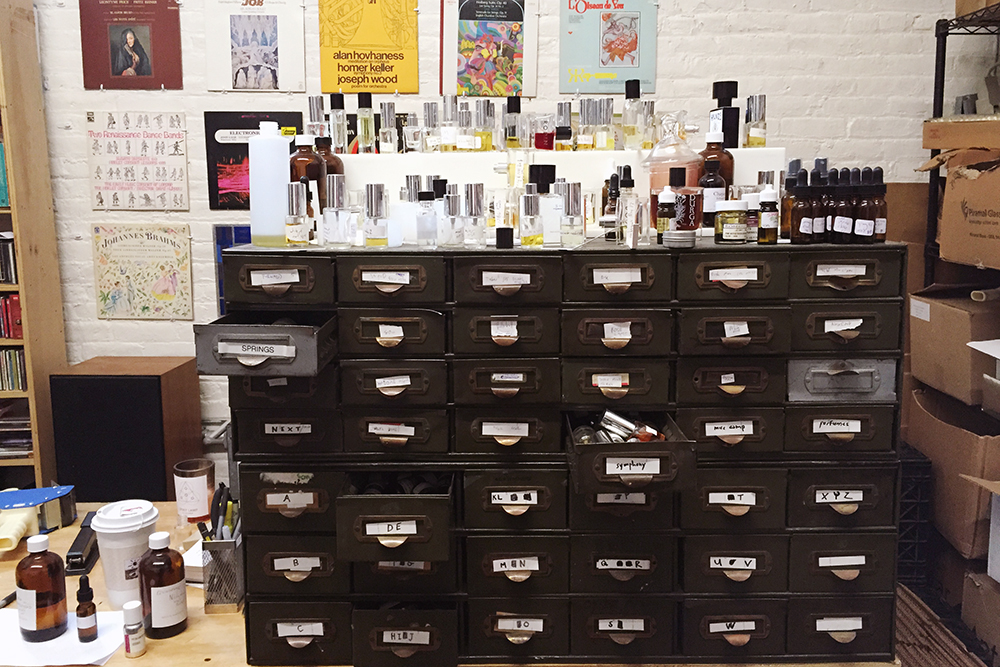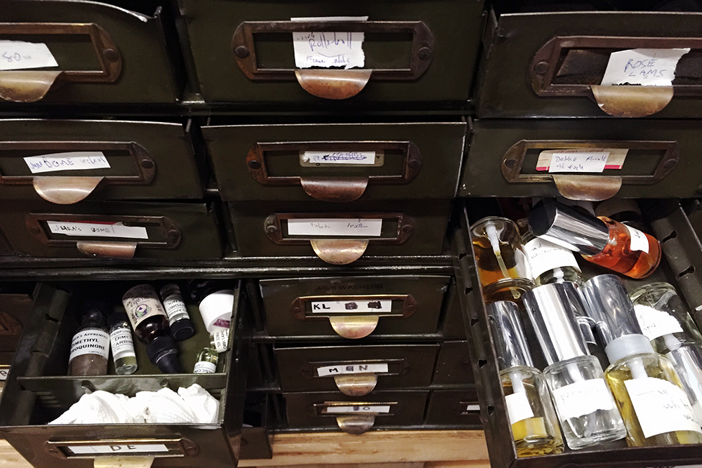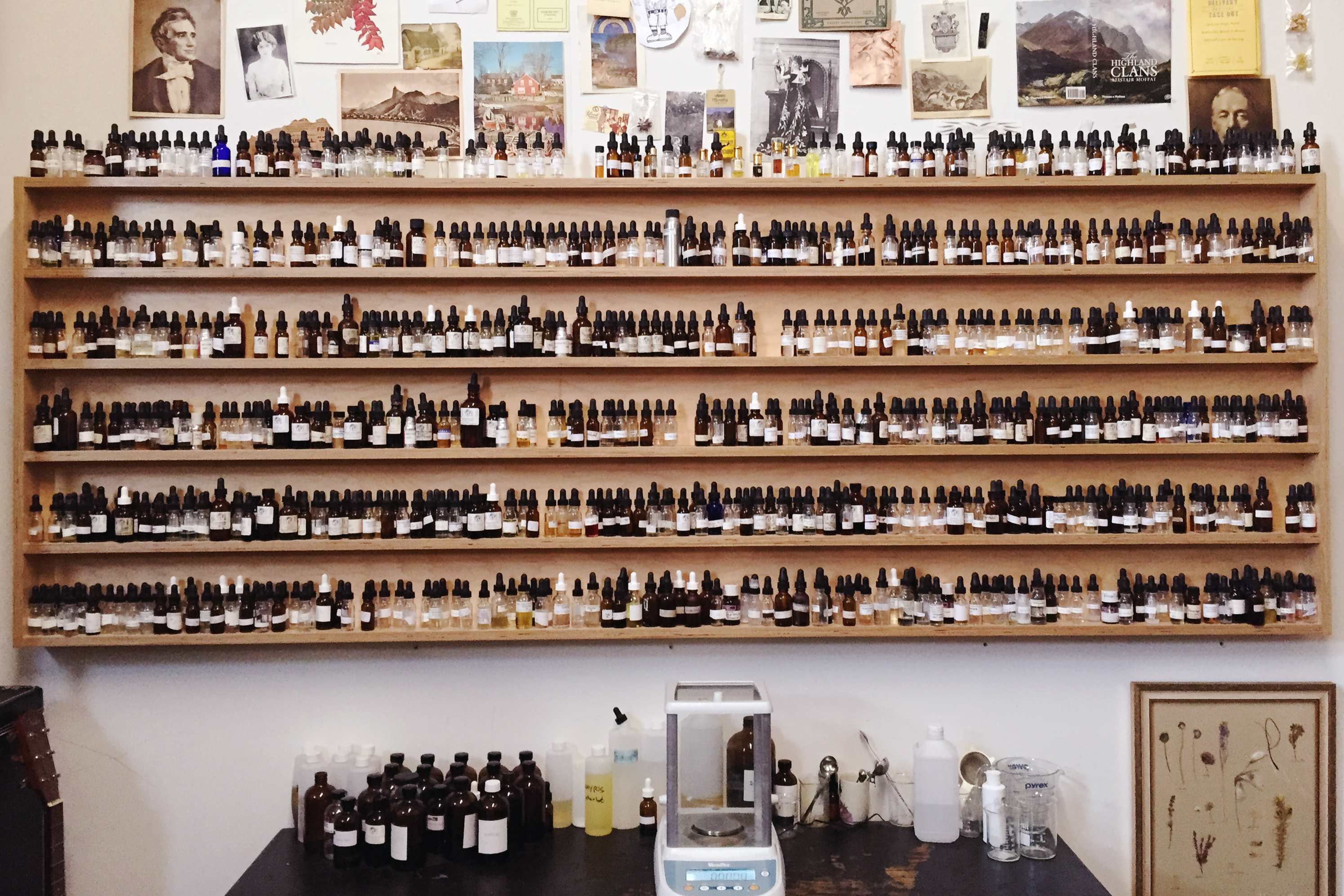 “Do you want to smell some awesome things and some awful things?” David asks, as he ushers me into their studio space. I figure it could only be uphill from what was going on outside, so I accept. Inside, I’m met with a mix of incredible scents wafting from the hundreds of tiny bottles that line the walls. As David pulled out different essences for me to smell, I asked Kavi how he keeps track of them all. “I’m sure there’s a method to the madness,” she said. “But I don’t touch them!”