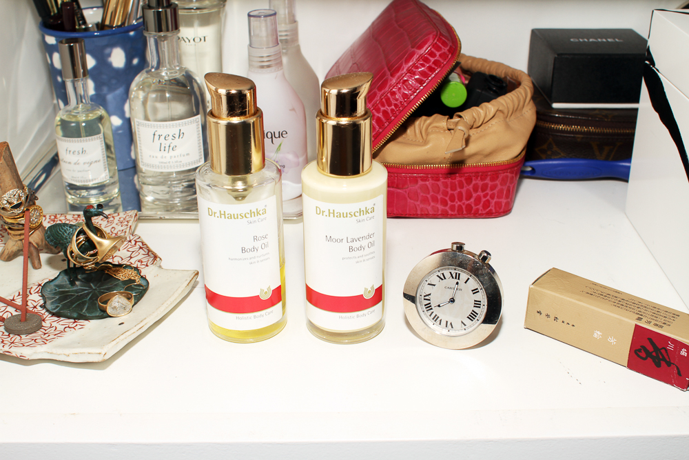 My one thing is that I shave my legs every day. I’m very dedicated to it because I don’t like the feeling of stubble at all. I use the big Venus with the moisture pads on it. Then I’ll put Neutrogena Body Oil all over. My favorite deodorant is the Fresh Sugar Roll On. It’s still got aluminum in it, so it’s probably terrible for you. But I’ve been using it for more than a decade.