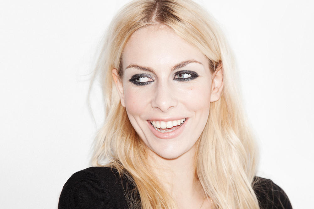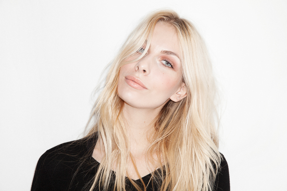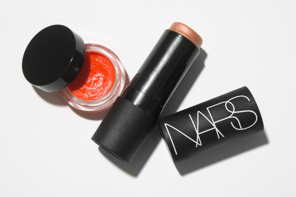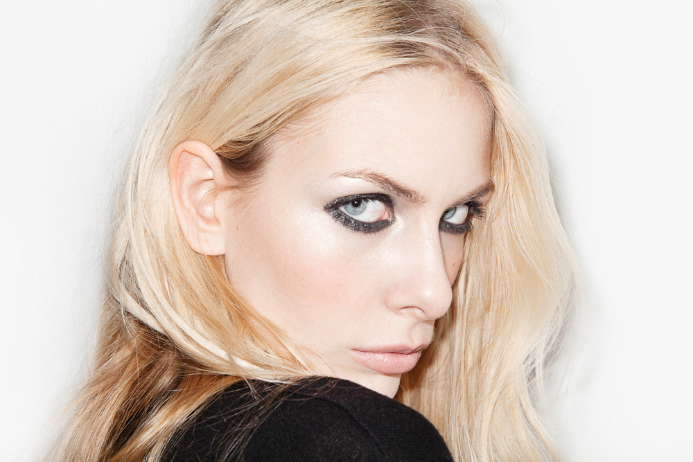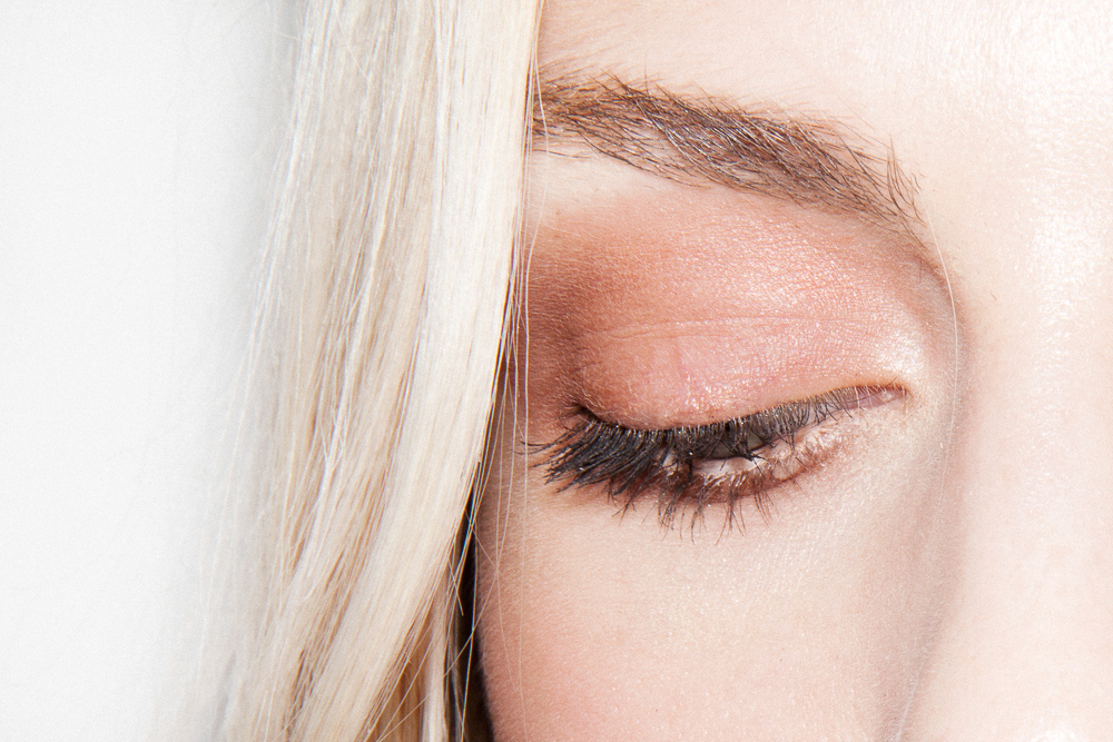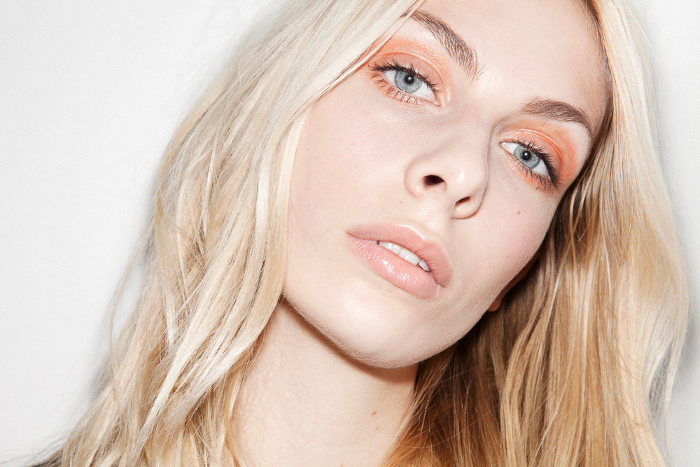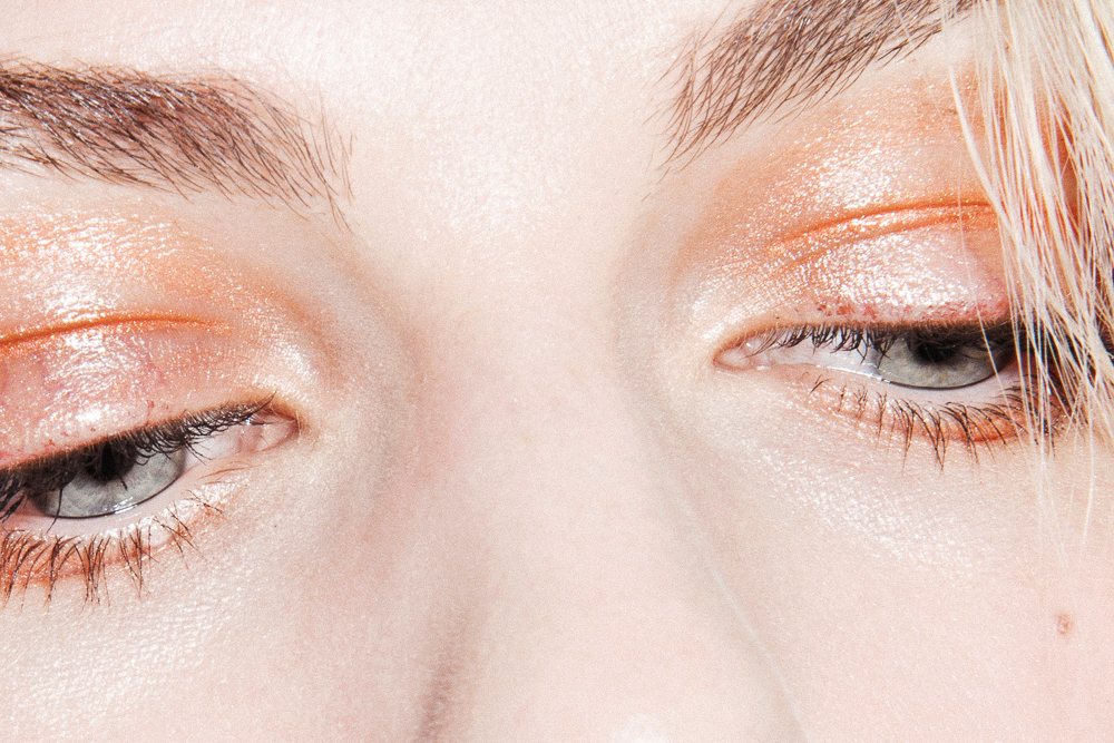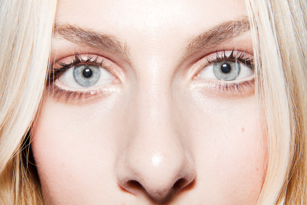 We begin—as any worthy endeavor does—with whisky. Alice recalls a late-last-summer moment of inspiration: “I was in a bar and was looking at the color of whisky in the glass, and I was like, ���One day I would love to make [an eye] look this color because it’s so beautiful.' So I made it with this”—she motioned over to the Nars Multiple in South Beach and Topshop Cheek Jelly in Phenomenon—“and it was amazing. I put South Beach underneath as a good base, because it’s nice and creamy.” Then Alice dabbed a little Cheek Jelly over the Nars: “Look how nice this is on top—it’s glossy, but it’s not a shimmer. The color [is] between apricot and whisky. Which works perfectly with blue.” To top it all off, Alice swiped on Marc Jacobs Beauty O!Mega Lash Volumizing Mascara in Blacquer 30 and Glossier Balm Dotcom for a little set and shine, explaining “the creaminess of it makes her look kind of magical. Blue-eyed people have this kind of fairy-ness, so it brings that out.”