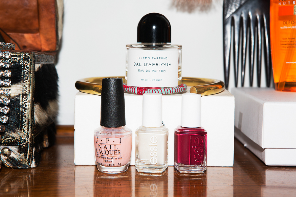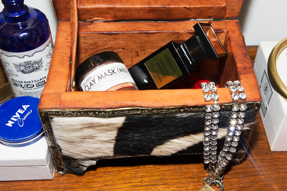 My first perfume was Lolita Lempicka. It came in a lavender-colored glass bottle that looked like an apple, and I think about it all the time. It’s a very nostalgic smell. I think we’re all very tied to different scents. I remember every guy in my school used to wear Cool Water or Ralph Lauren Polo Sport, and some would specifically mix the two. I remember them always being encased in a cloud of fragrance. Now, I really like Byredo’s Bal d’Afrique. I guess it’s the tones of it that I like, and I feel like it changes a lot when it’s on my skin. I also use the Tom Ford Tobacco Vanille sometimes, which I bought for my boyfriend, but now I use it too.