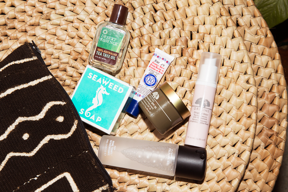 The first thing I do when I wake up is drink a huge cup of water. I’m like a flower that's is wilting and not cute if I don’t have water. Then, I’ll splash water on my face and use Fig + Yarrow Facial Scrub because it has coffee in it. Sometimes I’ll use it with my Clarisonic. It works really well, but I’m not married to it. I don’t use a cleanser, but sometimes I’ll use Acqua Distillata Alle Rose from H. Roberts & Co. on a cotton swab. If I have a pimple, I'll use this Desert Essence 100% Australian Tea Tree Oil. It’s really good at drying it out. I’m a little bit more prone to acne in humid places—I definitely bring it with me to Kenya. And if I’m somewhere really dry, I use MAC Prep & Prime Fix Plus because it just refreshes you. My boyfriend bought it for me after he saw a makeup artist use it on a shoot in Africa to cool everyone down. I use Nivea Creme to moisturize my lips, which I have used my entire life. It started when we would go skiing in Canada on school field trips. Someone was like, 'Have you ever put this on your lips?' So I did it, and it was amazing. I use Smith's Rosebud Salve if I want more of a shine.