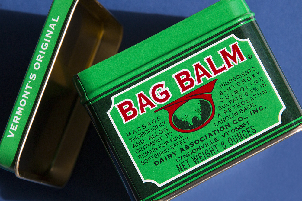 Formulated with lanolin, petroleum, and the antiseptic 8-hydroxyquinoline, Bag Balm is a product of Vermont's Original, based in Lyndonville, Vermont. Developed in 1899, it’s as “heritage' as a product can get. It’s thicker than Vaseline and presents a strong, medicinal scent that's pungent at first whiff but wears off on the skin over time.