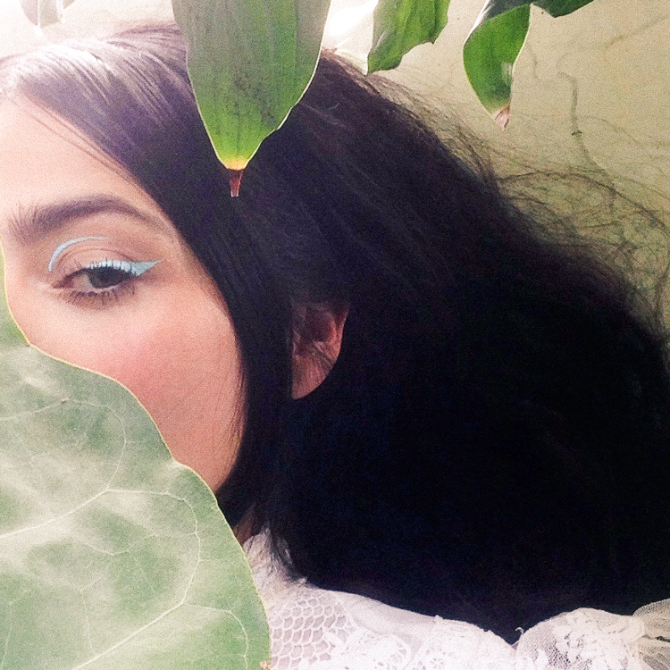 ** Lime Crime Eyeliner in Blue Milk has the perfect silky texture and an unbelievable color payoff. Draw a triangle-shaped cat eye on the outer corner of your eye. The graphic cat eye should dissipate into your middle lash line—disconnected. Then draw a line tracing your crease right above your eye socket extending to the inner corner of your eye. Sometimes when doing makeup, I think it's best to think of concepts instead of straightforward instructions. This look makes me think of a soft dash of light running across the eyelid. If that helps you get creative, the look is yours to play around with.