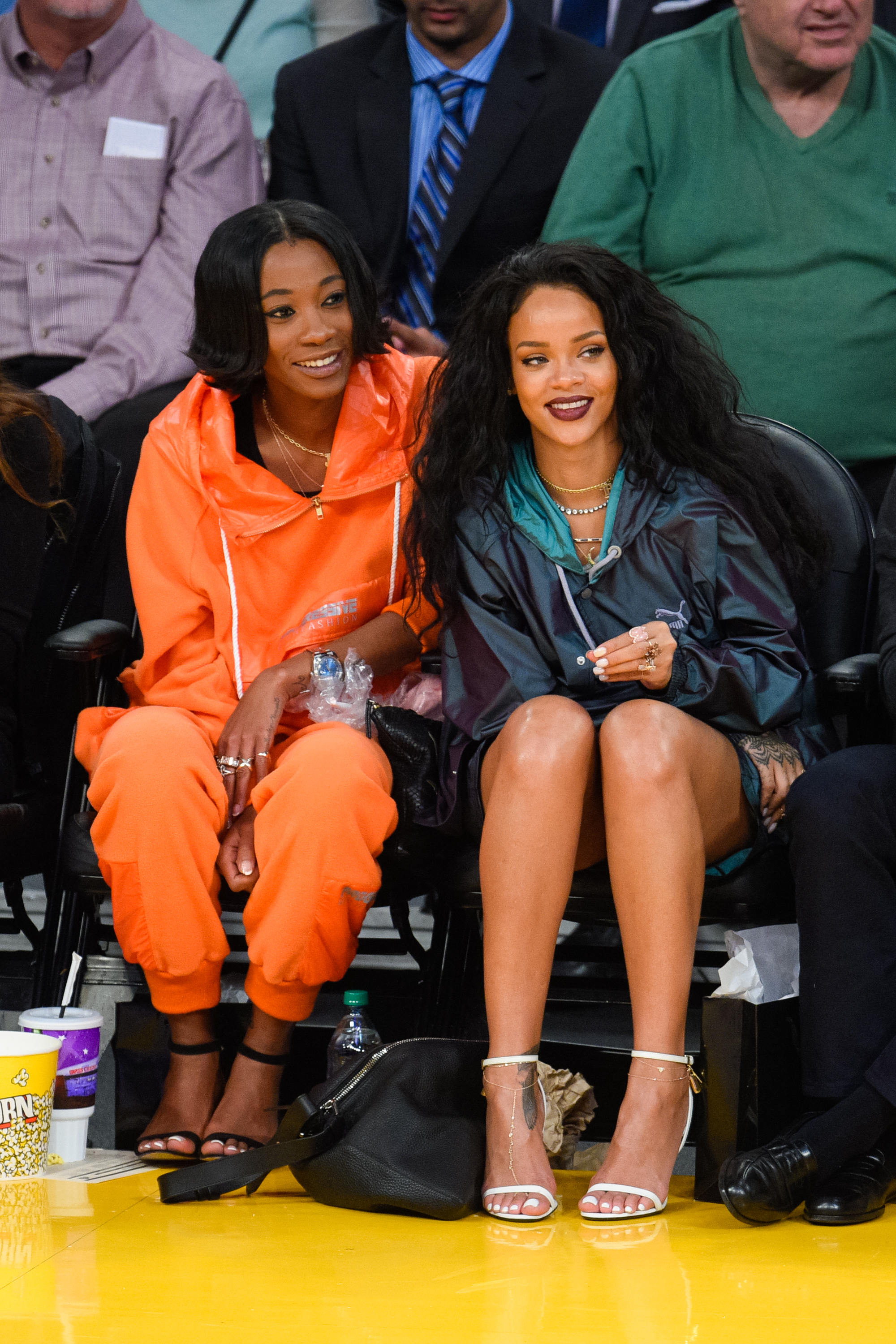 Somehow, someway, basketball games (of all things) have become the best place for star style in the red carpet's stead. Perhaps it's not surprising—the stadium is where you go to not only have nachos, but to willingly pay $10 for beer that'll get warm before you finish it. It's also the place where bad gal RiRi—all-around fox, singer, CFDA winner, and someone ITG loves so much that we named a conference room after her—gets the chance to wear a Céline dress with trainers to a Clippers game. Another winner: when she wore a windbreaker, athletic shorts, and strappy, single-soled sandals that match her White Out pedicure. Scroll through enough courtside paparazzi shots and you'll see a trend emerge: expensive shoes with workout gear; runway gowns with retro sneakers. Like high-low dressing, just a little bit more extreme. And with the playoffs coming up, consider it a call to action—or to athleisure.