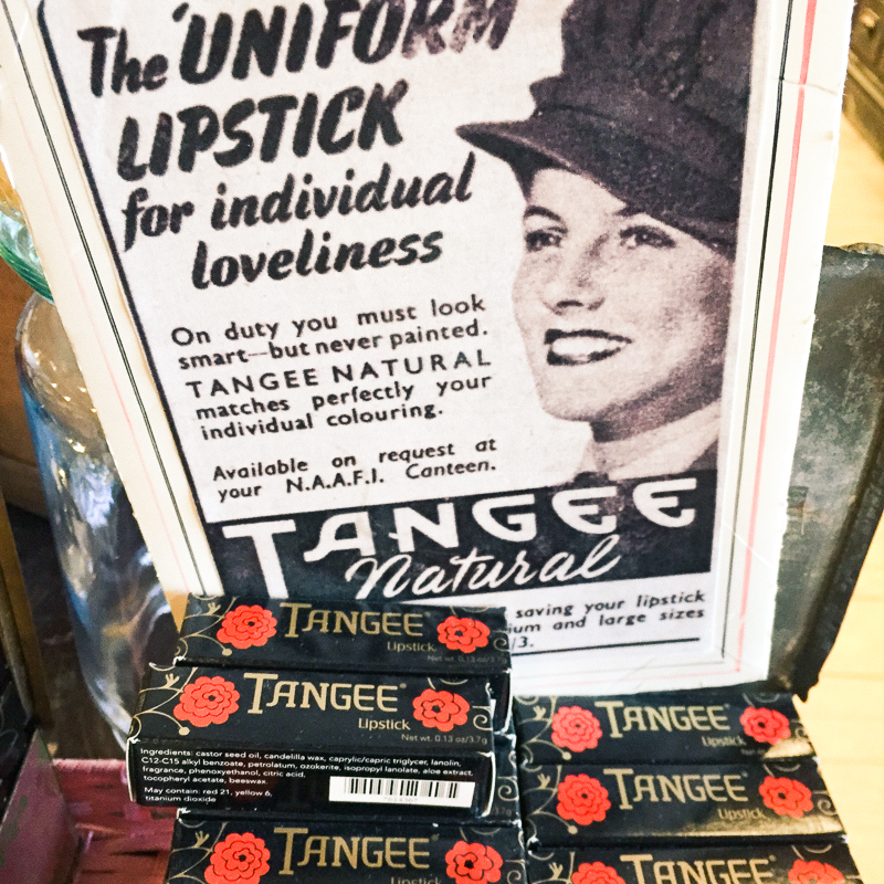 Tangee Lipstick, which has been used for over 70 years, goes on clear and changes color according to your skin tone. For my powder-white skin, Tangee turns a soft rose color and leaves my lips surprisingly soft for lipstick.