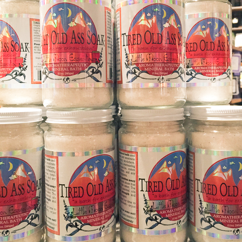 Tired Old Ass Soak Mineral Bath is made with rosemary and eucalyptus and tends to your aching muscles and nerves while rejuvenating your skin with a large dose of minerals. Its minty-but-warm scent clears out your lungs and makes everything around you dissipate into a fine steam.