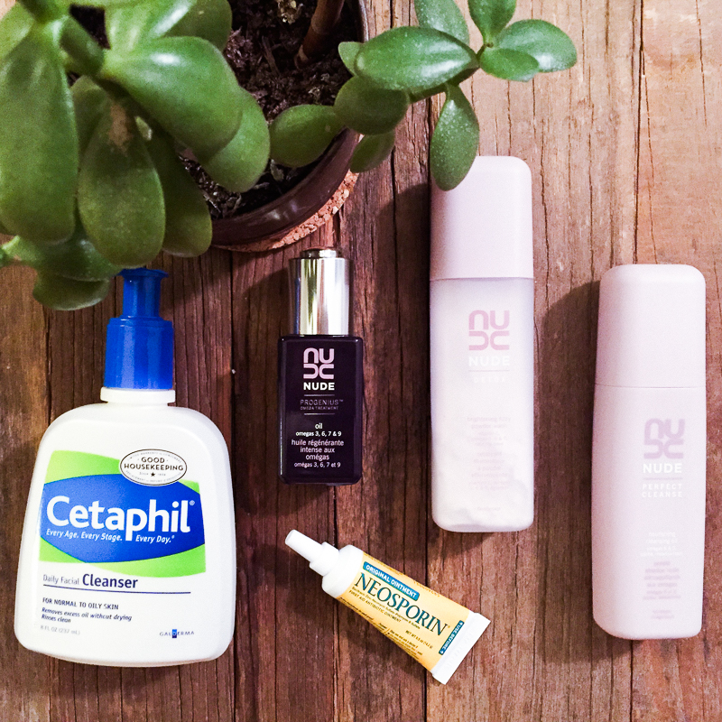 Skin: NUDE Detox Brightening Fizzy Powder Wash or NUDE Perfect Cleanse Nourishing Cleansing Oil in the winter; NUDE ProGenius Omega Treatment Oil; Cetaphil Daily Facial Cleanser; Neosporin Original Ointment