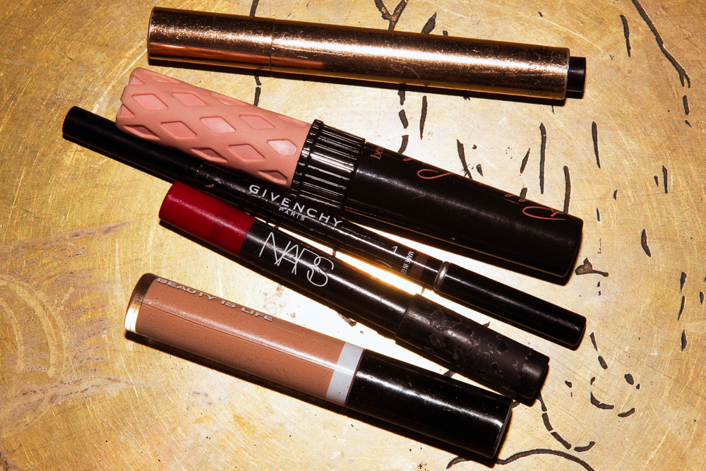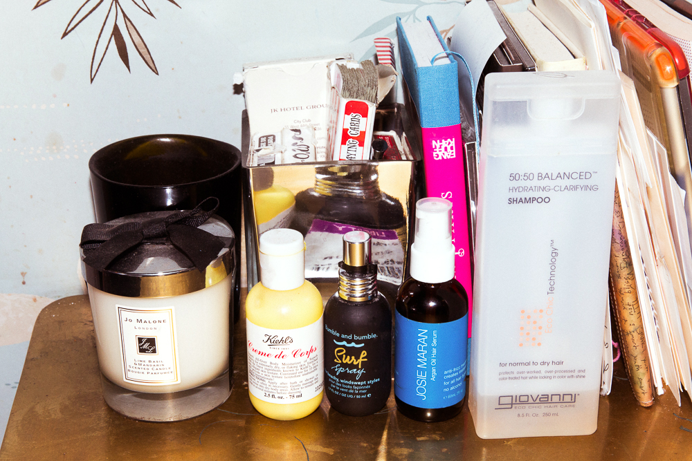 The only makeup I carry around in a bag is that eyebrow pencil and this one Nars color, Dragon Girl, which is this red lip that I can apply without any mess. Tina Turnbow used it on me for the 2010 Met and it stayed on! Then I have Roller Lash from Benefit and the Bumble and bumble Surf Spray so I can kind give myself some interesting texture without going weird and flat. Then there's my Beauty is Life concealer—I have no idea where I got that from. I bet a makeup artist used it on me and then left it for me. I attempt to us it sometimes on myself, but I’m not really good at concealing anything. I have no memory of ever buying it, but I trust that it works.
