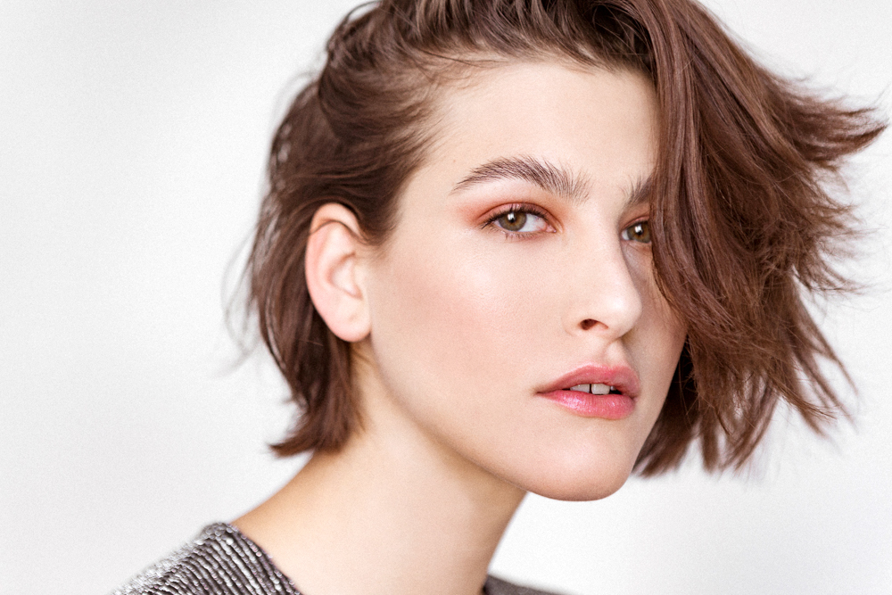 Grace started small here, using Kat Von D's Metal Crush Shadow in Raw Power blended out until the concentration was so slight, it almost looked taupe. Keep the rest of the face bright with this look—neutralize any redness under the eye with something like MAC's Eyeshadow in Omega and bring out the cheekbones with MAC Blush in Prism. Grace used Maybelline's Lash Discovery Mascara in Black on the lashes (“It's a super tiny wand so you can get all the way into the root') to make the look a bit more feminine. Accentuate with Rosebud Salve on the lips.