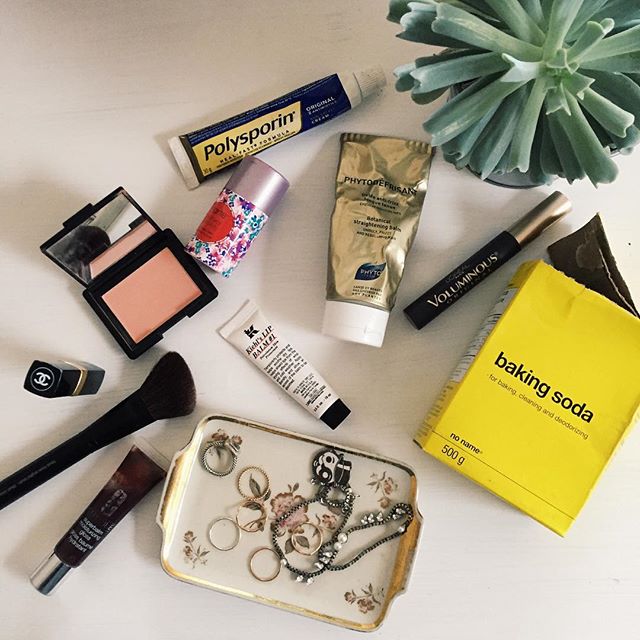 As far as skincare, I’ve just wrapped a year-and-a-half long affair with my Clarisonic. I would use it with Fresh Soy Cleanser or Andalou Citrus Kombucha Cleansing Gel—but lately I’ve been washing my face with coconut oil and just exfoliating with baking soda. I’ve actually used baking soda as an emergency exfoliator for years. Before that I always assumed it was bad for my skin because it costs a dollar, and how good can an exfoliator be if it doubles as a fridge deodorizer? But it’s amazing. It gets rid of blackheads like nothing else and I swear, a couple sprinkles from a dollar box of baking soda makes my skin look more glow-y than a $200 Clarisonic. After cleansing, I’ll use a spritz of rosewater to tone.