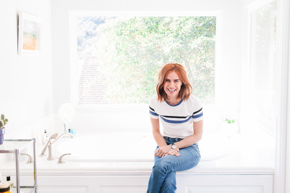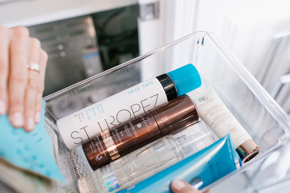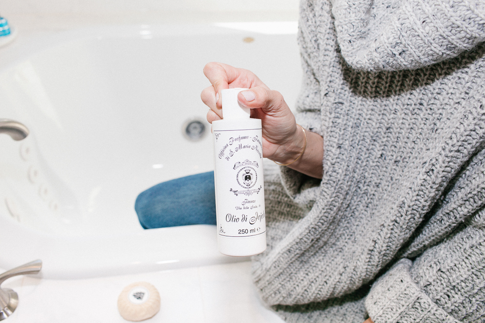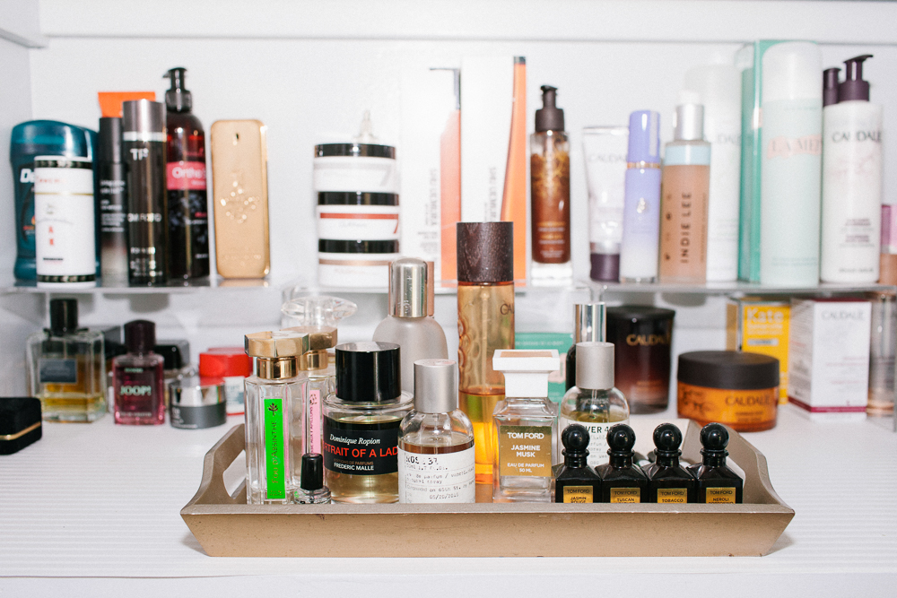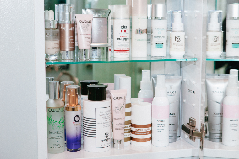I will rinse off in the morning, especially after the gym, but I love to take a bath before bed. I’ll do aromatherapy oils on the weekend and I’ll sit for a while. My husband has to come check on me! I’ve been really into making my own bath salts lately. I do Himalayan Sea Salt and eucalyptus. When you have an aesthetician’s license, you have access to so many crazy things in bulk—like every kind of oil. And I always do a mask when I sit in the bath. The Glamglow Thirstymud Mask is pretty good and this Arcona Wine Hydrating Mask is a good one, too. [For a scrub], I use the Caudalie Crushed Cabernet Scrub. It’s nice because it’s oily. It’s not super fragranced either, but it’s a good combination of smells. I also really like the Caudalie Nourishing Body Lotion, too. And then Vita Liberata makes the best self-tanning products. I use it on my arms and legs once a week.
