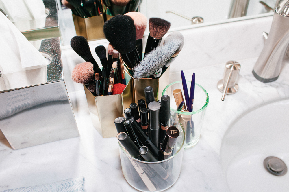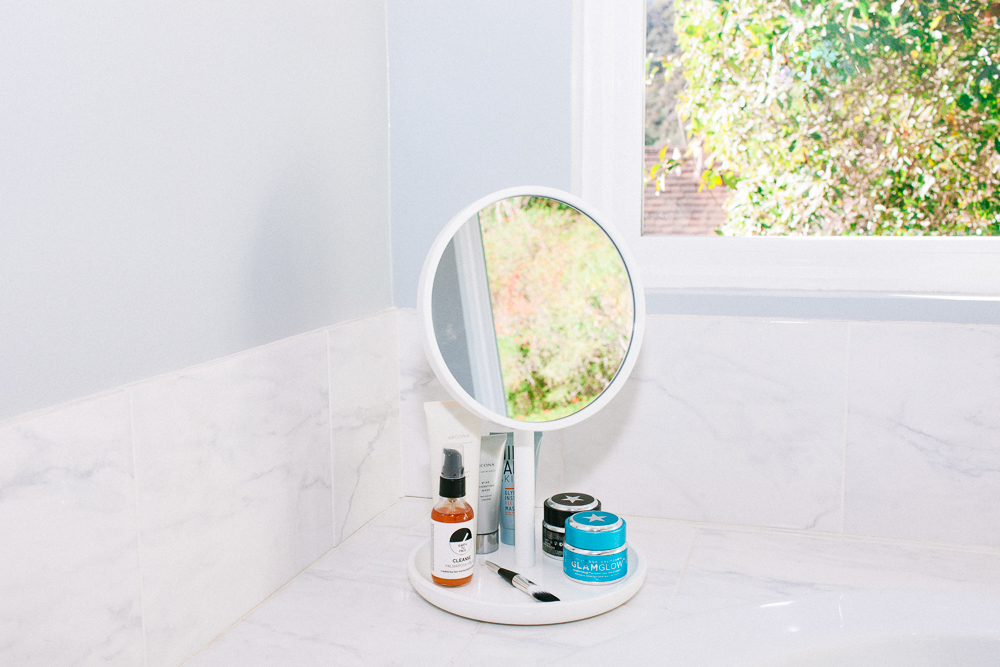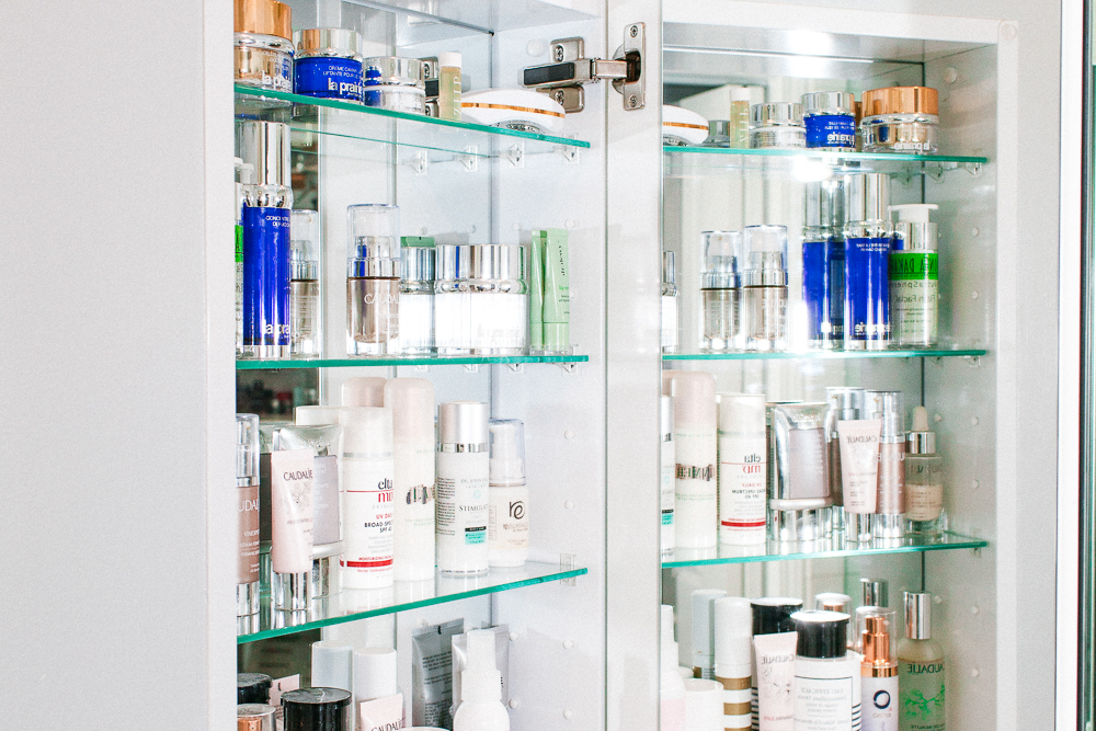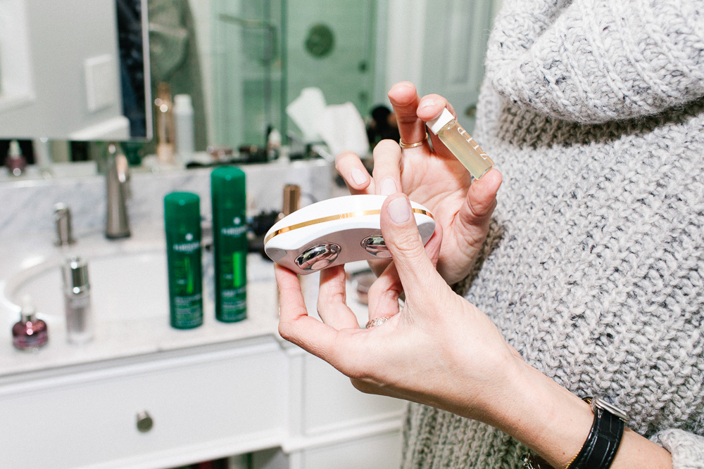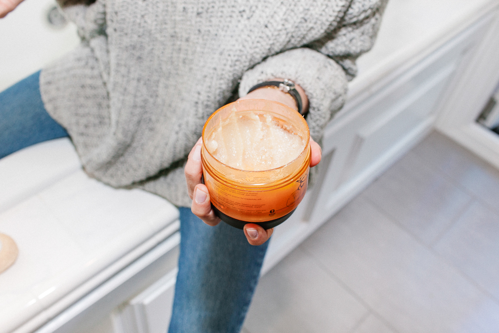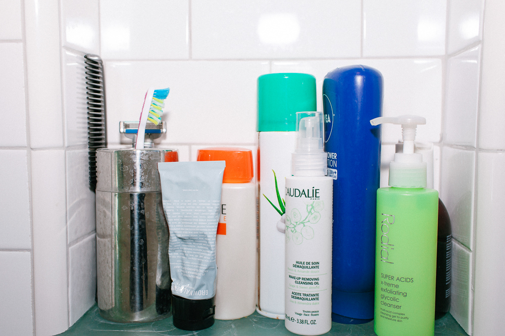 I will rinse off in the morning, especially after the gym, but I love to take a bath before bed. I’ll do aromatherapy oils on the weekend and I’ll sit for a while. My husband has to come check on me! I’ve been really into making my own bath salts lately. I do Himalayan Sea Salt and eucalyptus. When you have an aesthetician’s license, you have access to so many crazy things in bulk—like every kind of oil. And I always do a mask when I sit in the bath. The Glamglow Thirstymud Mask is pretty good and this Arcona Wine Hydrating Mask is a good one, too. [For a scrub], I use the Caudalie Crushed Cabernet Scrub. It’s nice because it’s oily. It’s not super fragranced either, but it’s a good combination of smells. I also really like the Caudalie Nourishing Body Lotion, too. And then Vita Liberata makes the best self-tanning products. I use it on my arms and legs once a week.