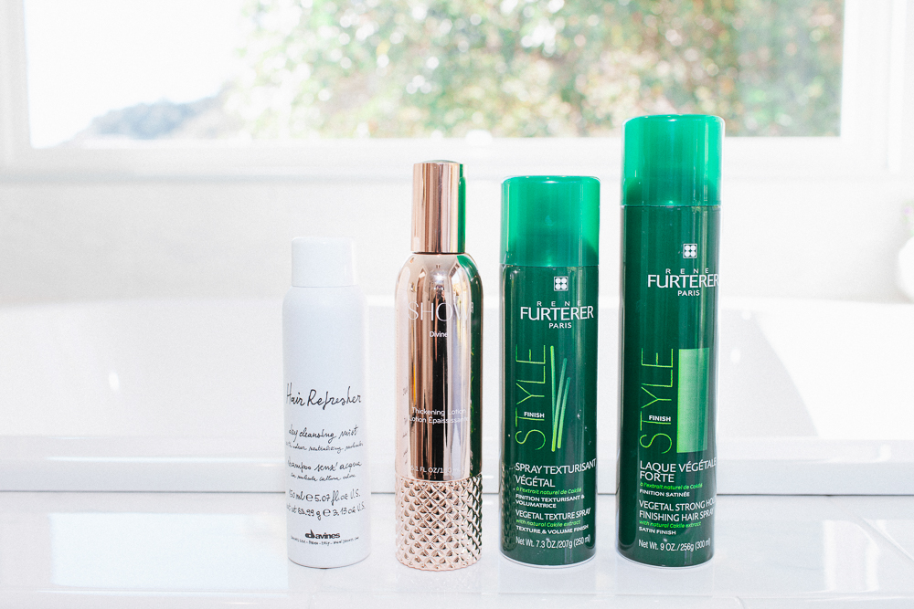 Three out of seven days of the week I get ready at the gym, which is super fast. And I typically only wash my hair three times a week—if I’m coming from the gym, I just dry shampoo it to put some texture in it. I always do some kind of oil, too. If my hair is clean, I’ll always do a texturizing spray. I’ve really been into the Rene Furterer one and it smells so good. The dry shampoo is really good, too. This Show Beauty Treatment Oil I put in when it’s wet and dry it and it adds a little texture and volume, but it softens your hair a little bit. I have this Davines Hair Refresher for if your hair is a little bit dirty. I’ll use my straightening iron to get that S-wave bend in it–it’s from ghd, the Eclipse.