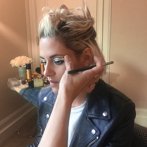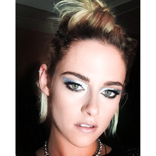 Jillian: "Kristen's eyes have such a nice shape, we almost always do a worn in eye on her. We wanted it to still have that look, but with a bit more of a chrome punch. I started with a base of Chanel's Stylo Fresh Effect Eyeshadow in Vert Grisé—it's like a gel chubby shadow stick. With that, we started to creat the shape, and then with a nylon angled brush I went over it with silver shade from the Les 4 Ombres Quadra Eyeshadow in Tissé Ombre de Lune. Once you press that it, it looks like foil. Then we cut it out in a geometric shape and then we said OK! We didn't want to get too precious about it. Get the concept, apply it to the human, be done.