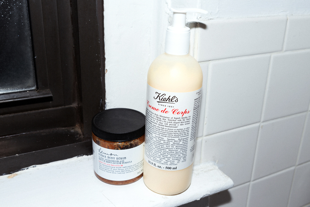 Sugar Body Scrub from C.O. Bigelow is really great for the whole body. And I use Kiehl’s Crème de Corps. It’s incredibly moisturizing, and it sinks in. This is going to sound a little bit weird, but I tend to be late for everything, so I run out of the shower and put lotion on my legs and I need it to absorb quickly because I want to put jeans on immediately. It goes in quick—or maybe I just have super dry legs and they’re dying of thirst.