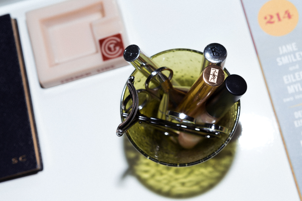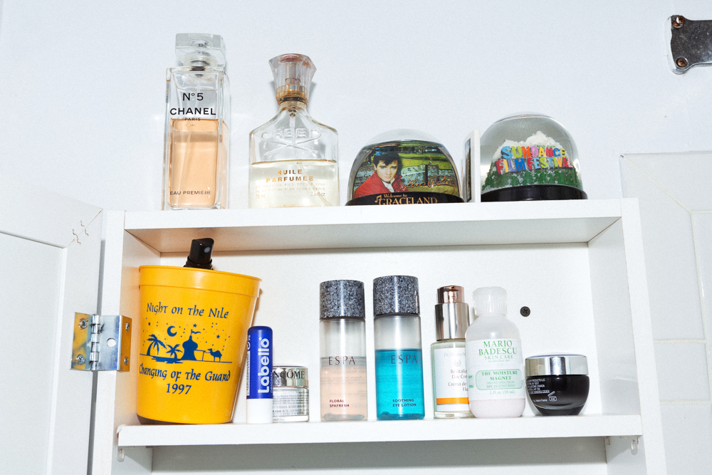 Daily I don’t really wear foundation because I make my own DIY BB cream with Mario Badescu Moisture Magnet and a little bit of Diorskin Nude Skin-Glowing Makeup. It’s mainly moisturizer and a dab of foundation to color it. Then I put on setting powder or bronzer right before leaving the house. If I’m going out, it feels like a serious thing to get ready. I work from home so there’s no need to dress up. And sometimes getting dressed up makes me feel cartoony. I like to mix Clinique Black Honey with Chanel Rouge Coco in Paris [ed note: Paris is discontinued—try Romy]. Then I use YSL Touche Éclat and curl my lashes—no mascara though. My eyes are too sensitive for anything close to my eyes. I can’t even wear contacts.