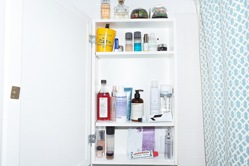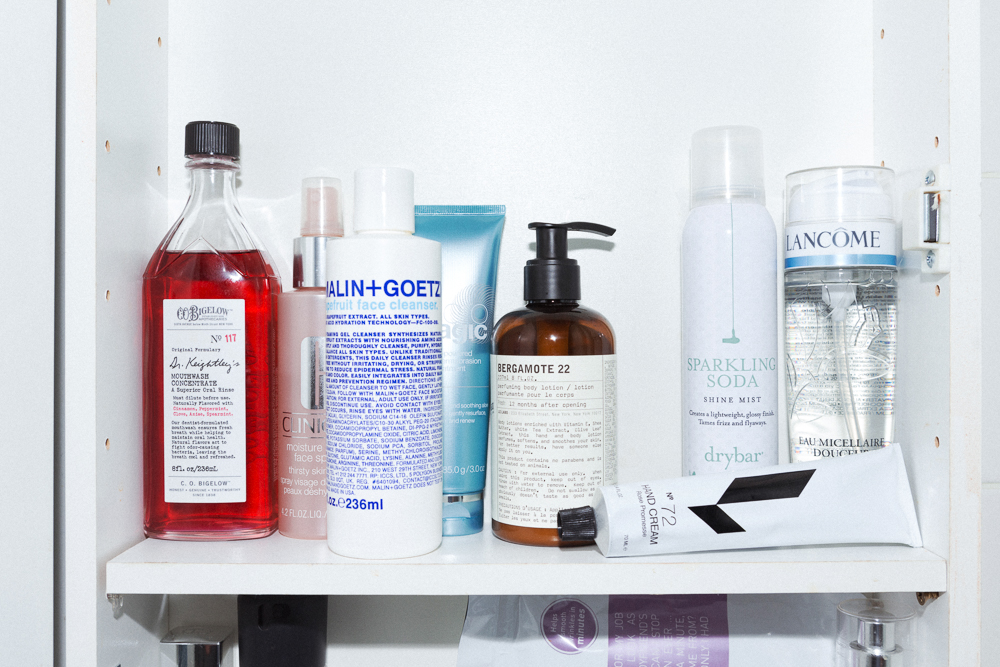 I wash my face at night instead of the morning—I don’t want to dry my skin out, but I also don’t want to break out! I take makeup off with Lancôme Eau Fraîche Douceur. It is really good—that’s one thing that doesn’t irritate my eyes at all. And then I use the Malin and Goetz Grapefruit Cleanser. I like how it smells, but I think it can be a little bit drying. But also I feel like, living in the city, there’s always a perpetual layer of gunk on your face. Sometimes I mix in Bliss Micro Magic to exfoliate.