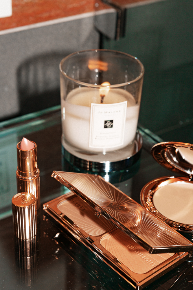 I have a face that can take a lot of makeup—I have so much fun with it. But if I’m not doing a photoshoot or if I’m not in front of someone, my makeup look will just be mascara. I love Estée Lauder Turbolash. There’s a little motor in it that makes it vibrate to make the lashes look quite long. And I fill in my eyebrows with a Charlotte Tilbury Brow Lift. Super easy. She actually personally taught me how to brush them out so it kind of looks more natural. The goal is to have the Brooke Shields eyebrows, so that product is important to me. Charlotte also makes a good nude lipstick for me called Penelope Pink. For contour, I cut my face in half for sure. I use the Charlotte Tilbury Bronze and Glow Powder. It’s actually a pretty universal shade.