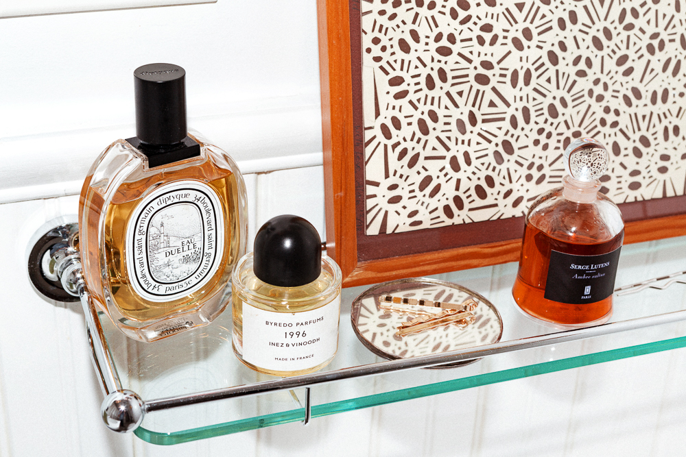 My all-time favorite fragrance is Serge Lutens’ Ambre Sultan. I keep a different Sultan in my purse by Loup Charmant. I like an amber scent. And the Byredo Encens Chembur, it smells like a Catholic church, and it’s the only bottle of perfume I’ve finished all the way. I tend to keep Byredo in my office because they’re refreshing, but I always come back to the Serge."