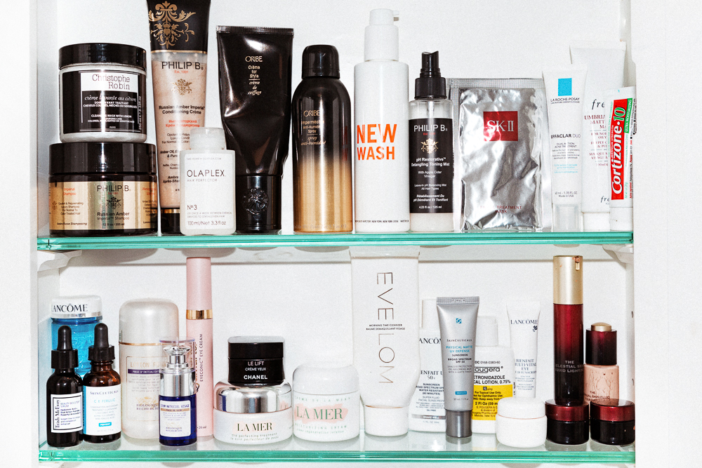 When I wake up, the first thing I do is use Eve Lom Morning Time Cleanser and then I let my skin rest for five minutes while I make coffee or tea. It’s very gentle and moisturizing so it doesn’t leave my skin dry. At the end of the day I use the Eve Lom Intensive Cleanser, which I do in the shower with the wonderful cloth she gives you. Then I’ll use the Skinceuticals CE and pat it in very gently with my fingertips. I think that one smells like a palm that’s been holding a penny—a little coppery. It’s kind of a gross smell that I’ve come to love. It’s the only product where, when I stop using it, I see a noticeable difference. Your skin texture and luminosity actually changes. Then I use a Trish McAvoy Beauty Booster Serum that has hyaluronic acid in it and Amarte Eyeconic Eye Cream every night. Then I’ll sometimes do an Olaplex and SK-II night where I lather up, do a mask on my face and hair, and chill. I don’t know what’s in the SK-II masks but when you take it off after an hour, you look noticeably better.