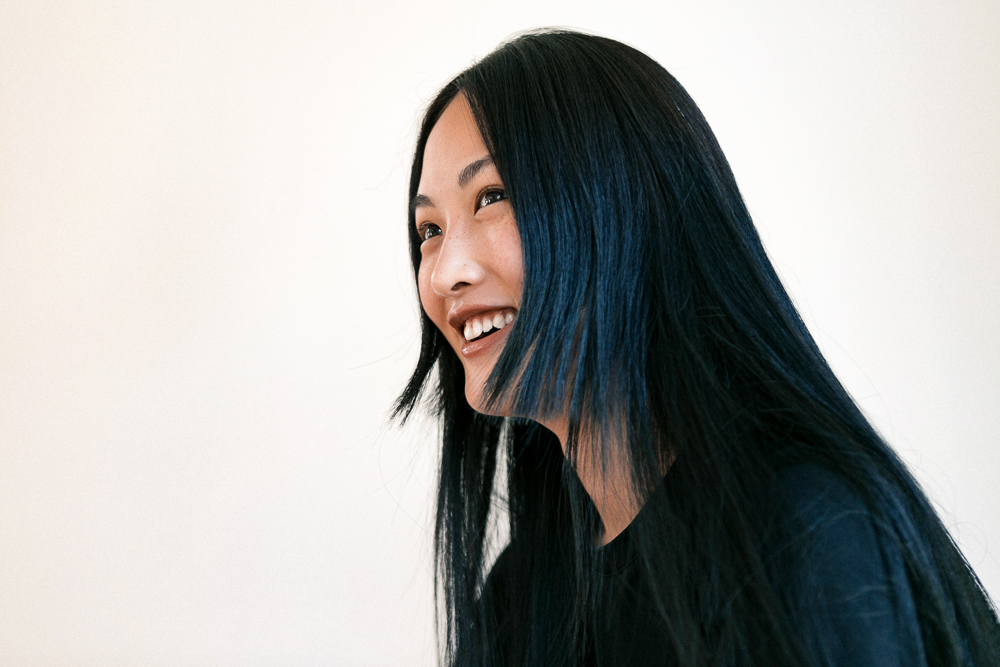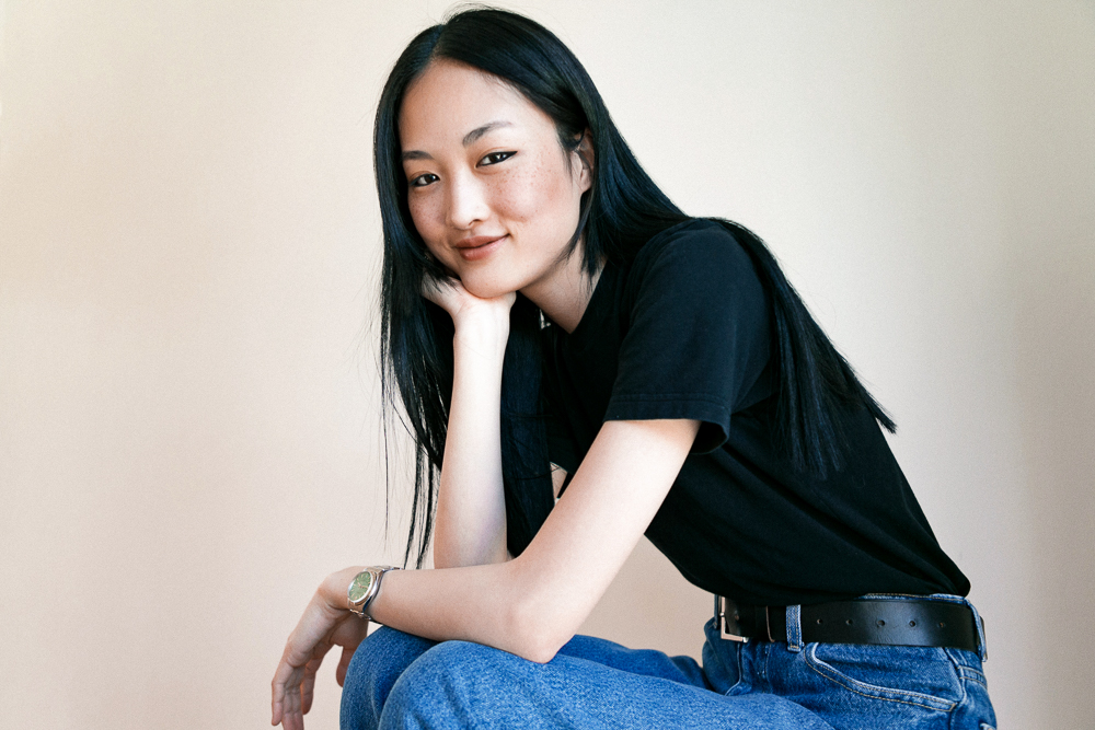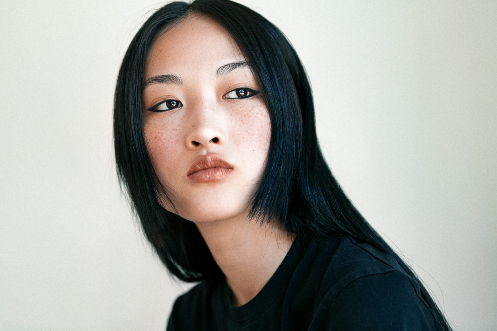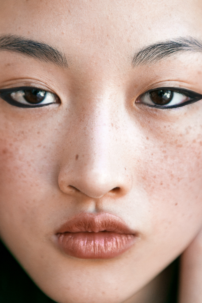 Jing Wen photographed by Tom Newton. Jing wears Marc Jacobs Highliner Gel Eye Pencil, Chanel CC Cream, and Guerlain La Petite Robe Noire Lipstick in Python Bag.