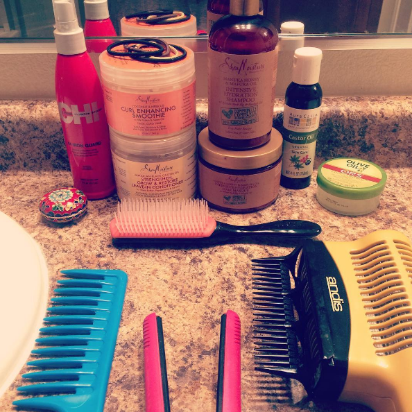 My sisters are some of my biggest beauty inspirations, especially when it comes to hair. They helped me transition from relaxed hair to my natural texture by introducing me to Shea Moisture—it's some of the best haircare. I love the Manuka Honey and Mafura Oil Shampoo and Intensive Hydration Masque, they're both very nourishing and smell delicious. Their Coconut and Hibiscus Curl Enhancing Smoothie mixed with a little bit of Chi Silk Infusion is my favorite product combo for a twist-out. Depending on how much you use, you can get really defined twists or looser waves. When my sisters and I lived together, our bathroom cabinet looked like the CVS Natural Hair aisle. It's something I'm really grateful we bonded over.